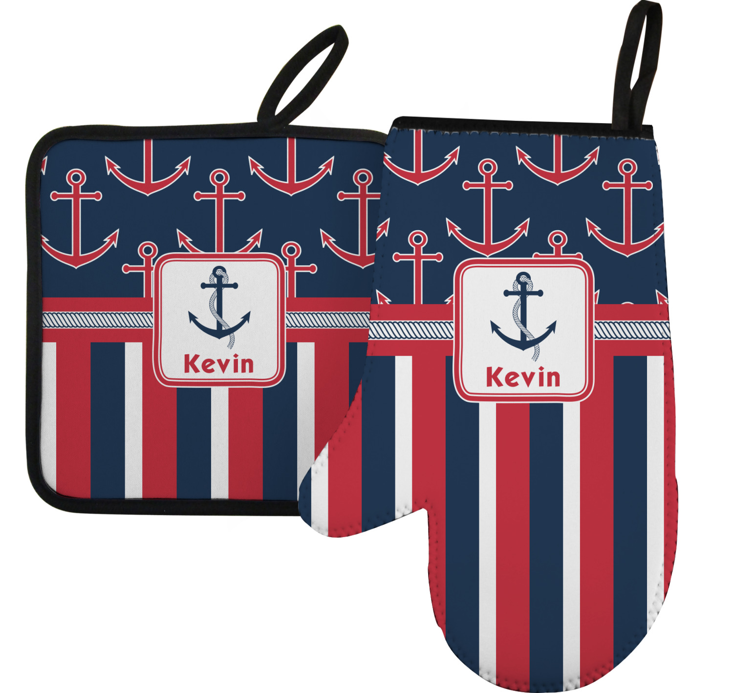 Along with our heat resistant gloves, we also carry personalized pot holders. These pot holders also feature a neoprene front that displays your personalization, and a textured, rubber backing for a sturdy grip. The two materials are connected with a sleek, black trim, and the hot pot holder also includes an attached loop for hanging and storage. You can purchase a kitchen pot holder by itself, or alongside a right or left oven mitt, depending on your needs. The pot holder itself is approximately 8.75 inches by 8.75 inches and 0.25 inches tall.