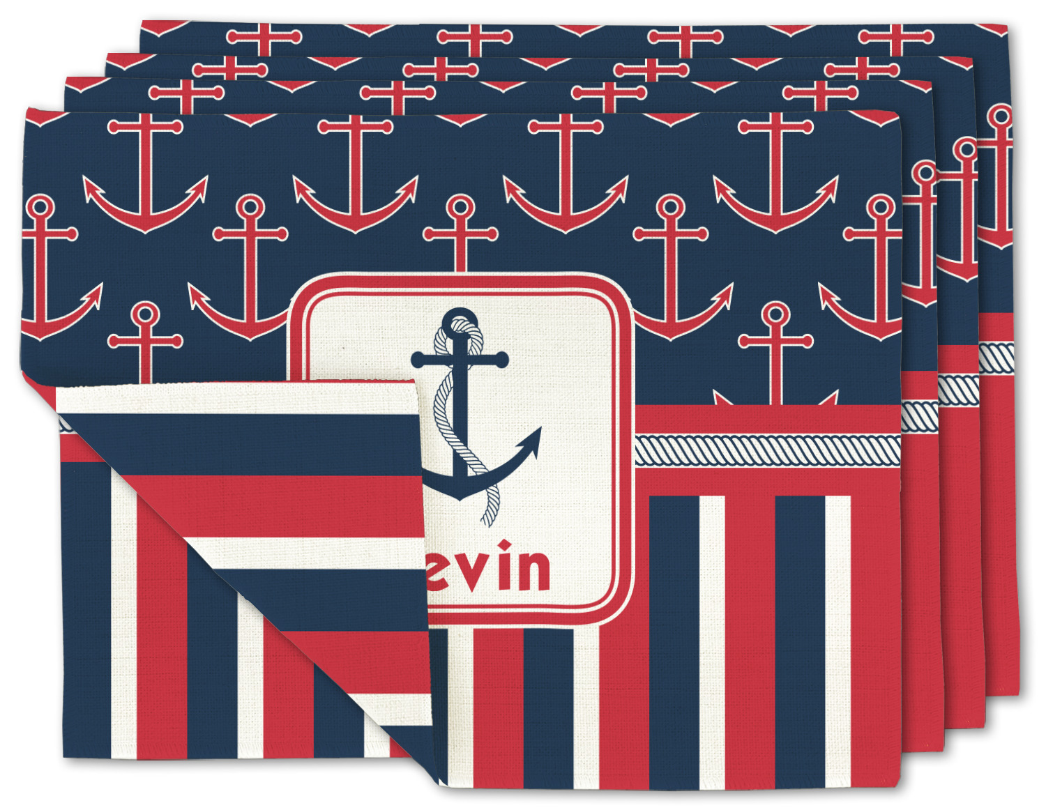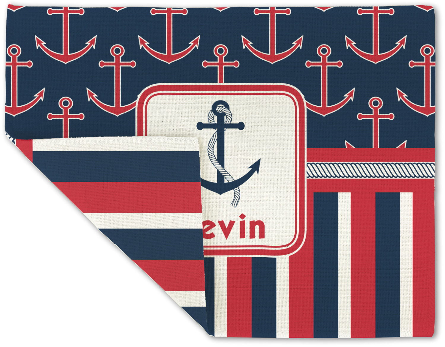 This nautical design features anchor pattern on top and stripes on the bottom. We chose to use the classic navy, red and white colors for our design. We chose the ribbon with rope, along with a squarish frame that contains a graphic and text. We use the anchor with rope for our graphic and a name for our text / personalization.