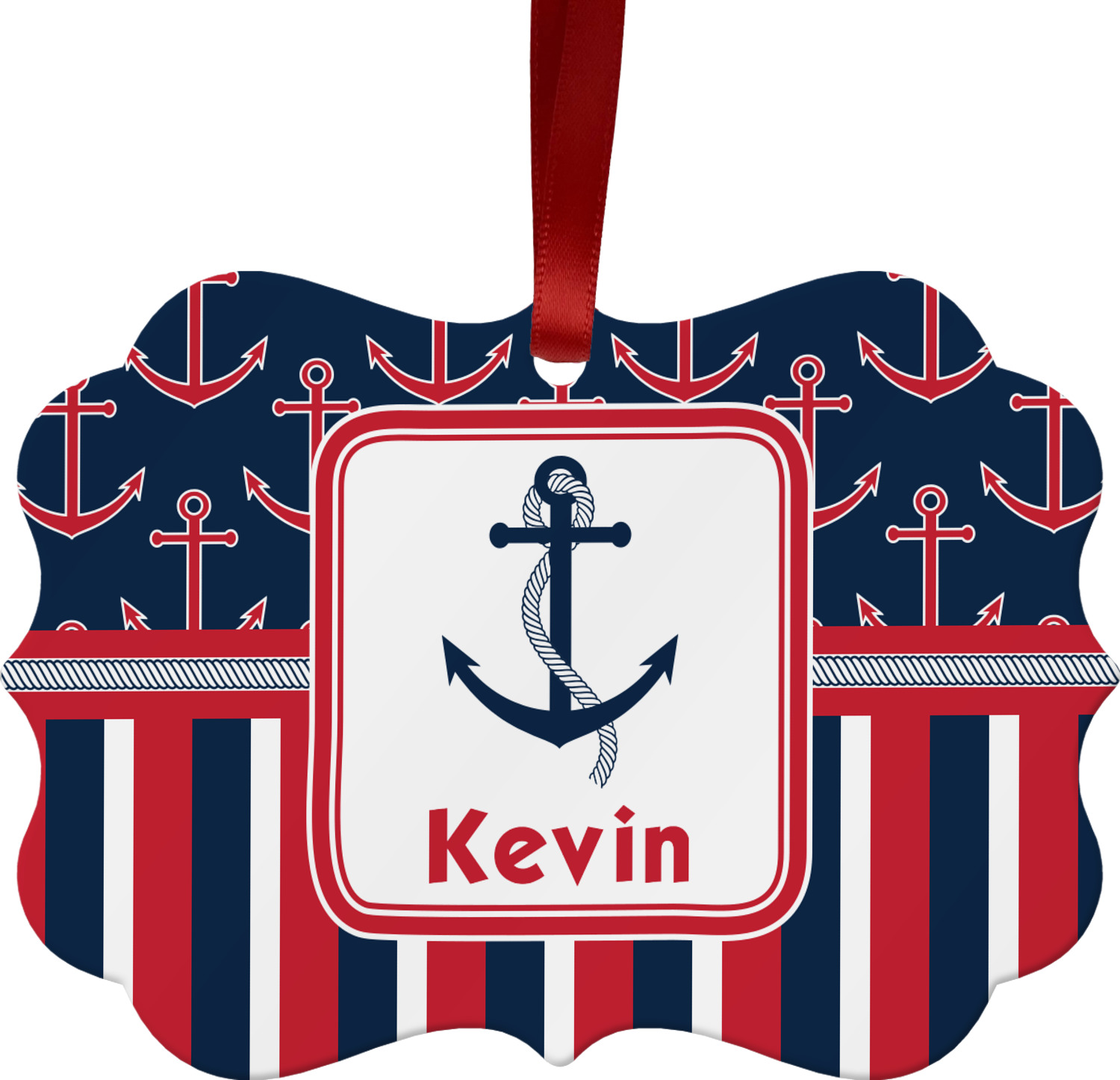 This nautical design features anchor pattern on top and stripes on the bottom. We chose to use the classic navy, red and white colors for our design. We chose the ribbon with rope, along with a squarish frame that contains a graphic and text. We use the anchor with rope for our graphic and a name for our text / personalization.