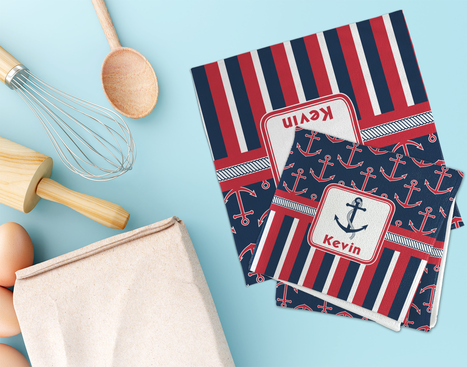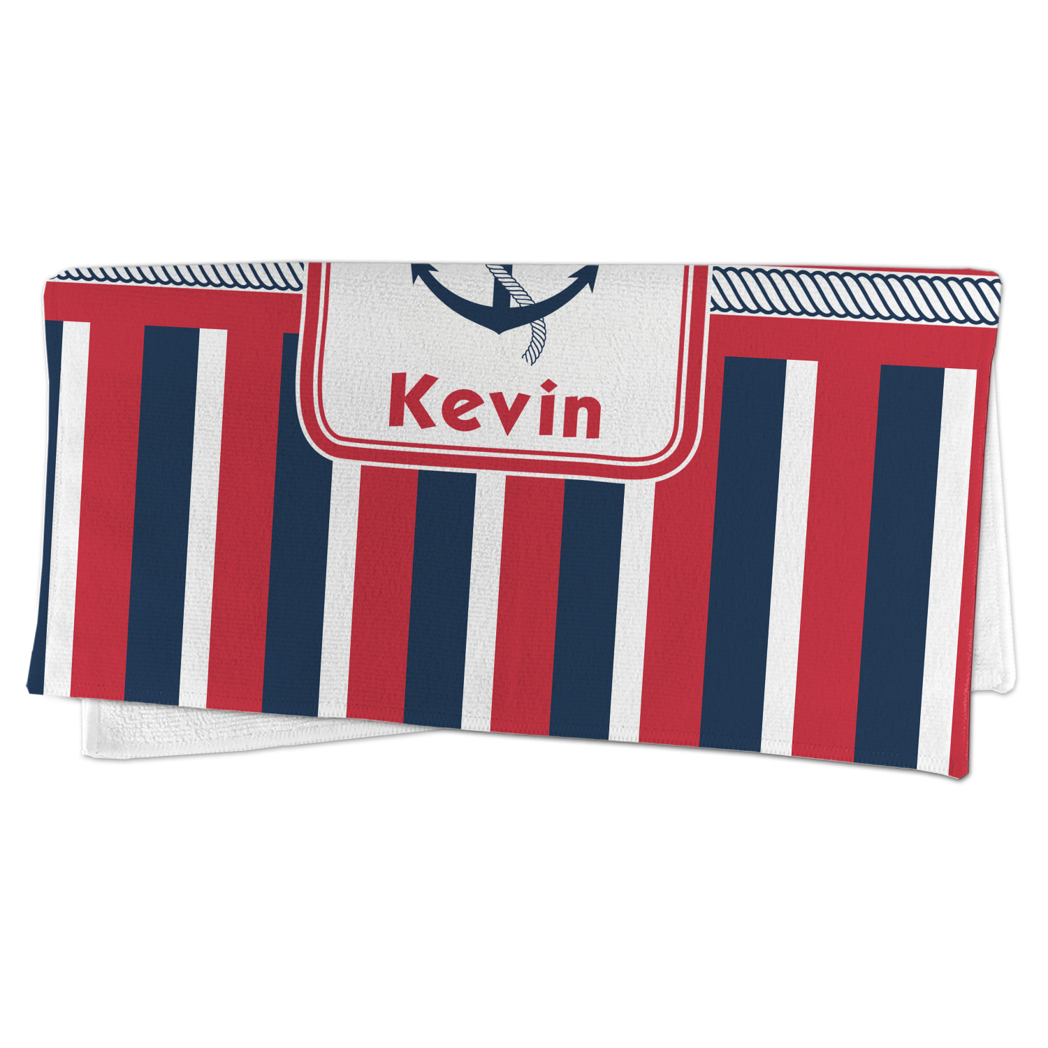 This nautical design features anchor pattern on top and stripes on the bottom. We chose to use the classic navy, red and white colors for our design. We chose the ribbon with rope, along with a squarish frame that contains a graphic and text. We use the anchor with rope for our graphic and a name for our text / personalization.