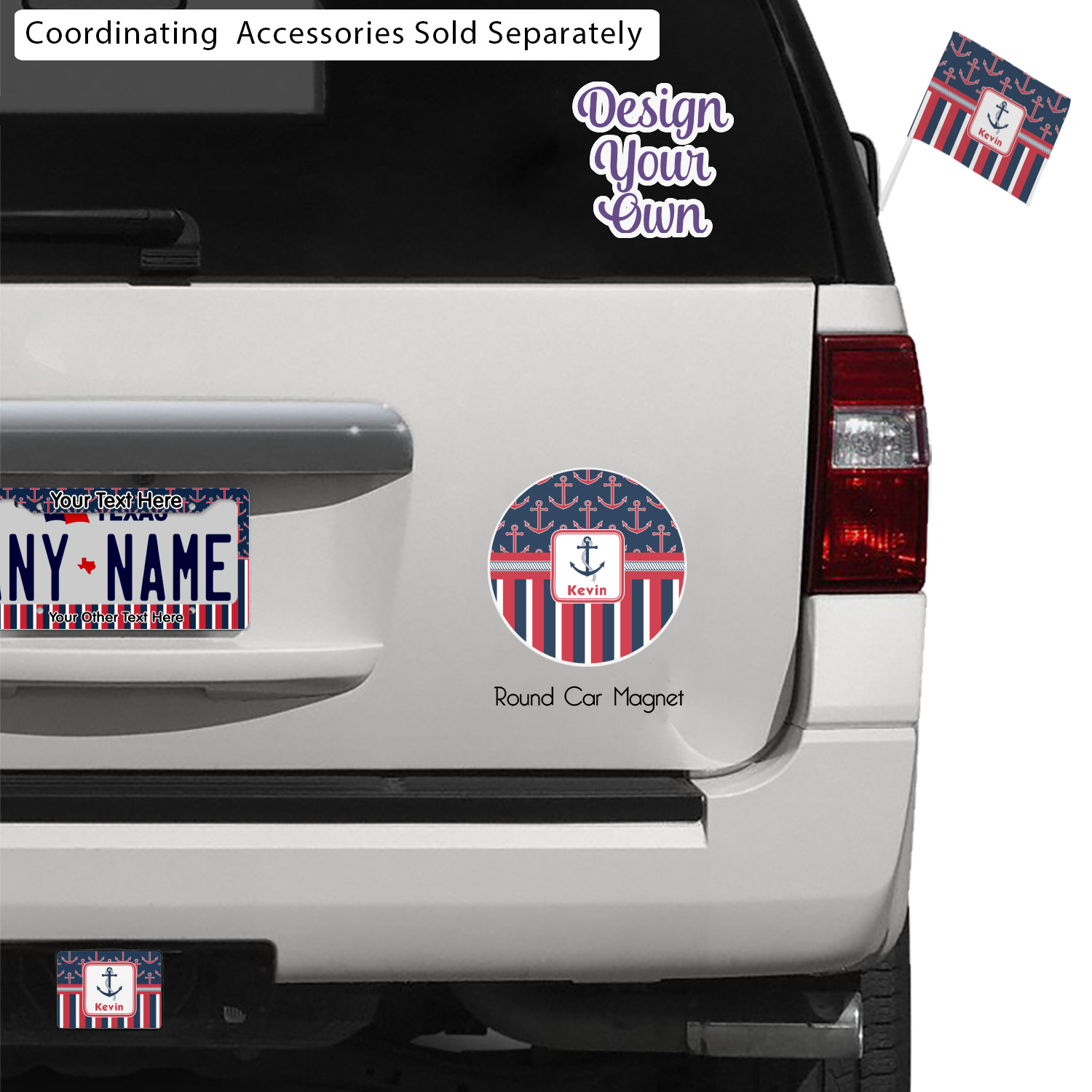 This nautical design features anchor pattern on top and stripes on the bottom. We chose to use the classic navy, red and white colors for our design. We chose the ribbon with rope, along with a squarish frame that contains a graphic and text. We use the anchor with rope for our graphic and a name for our text / personalization.
