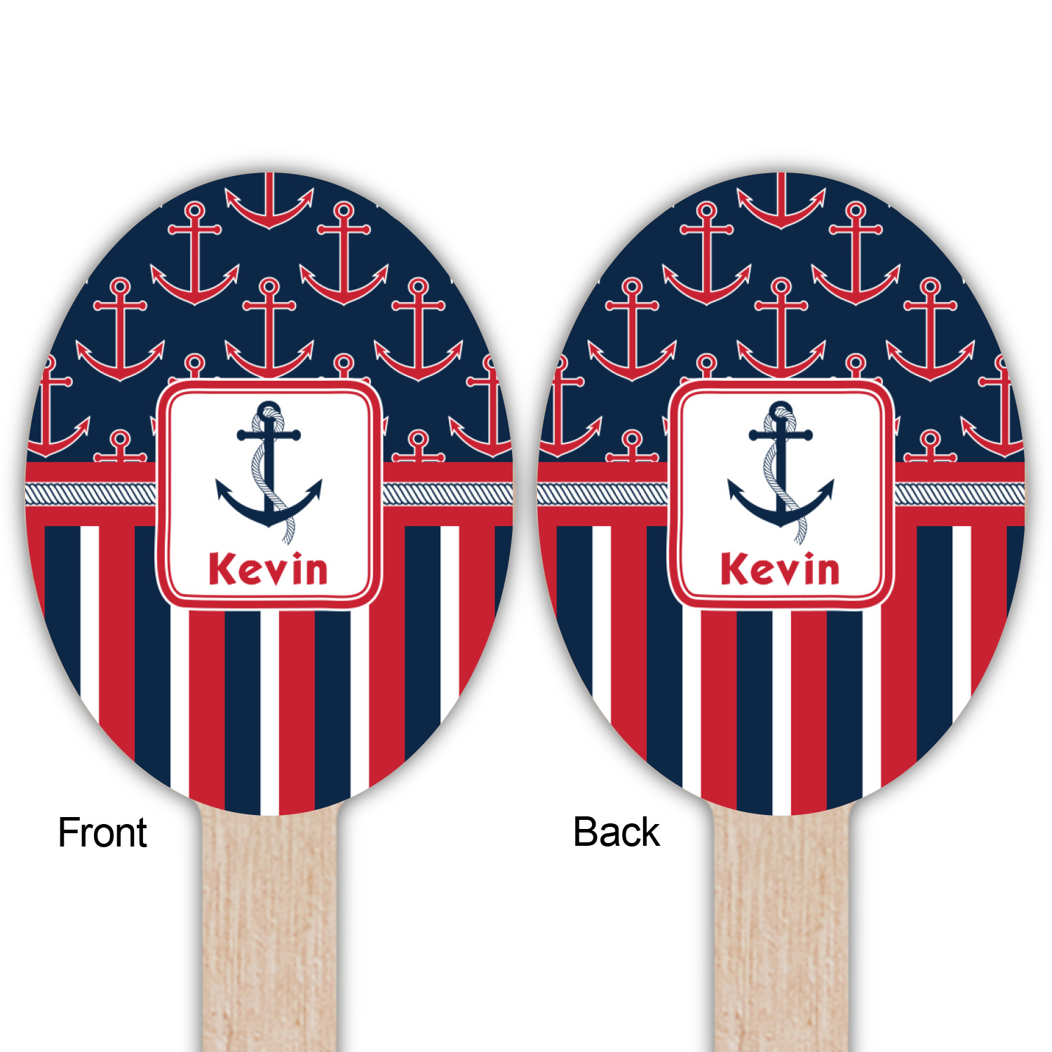 This nautical design features anchor pattern on top and stripes on the bottom. We chose to use the classic navy, red and white colors for our design. We chose the ribbon with rope, along with a squarish frame that contains a graphic and text. We use the anchor with rope for our graphic and a name for our text / personalization.