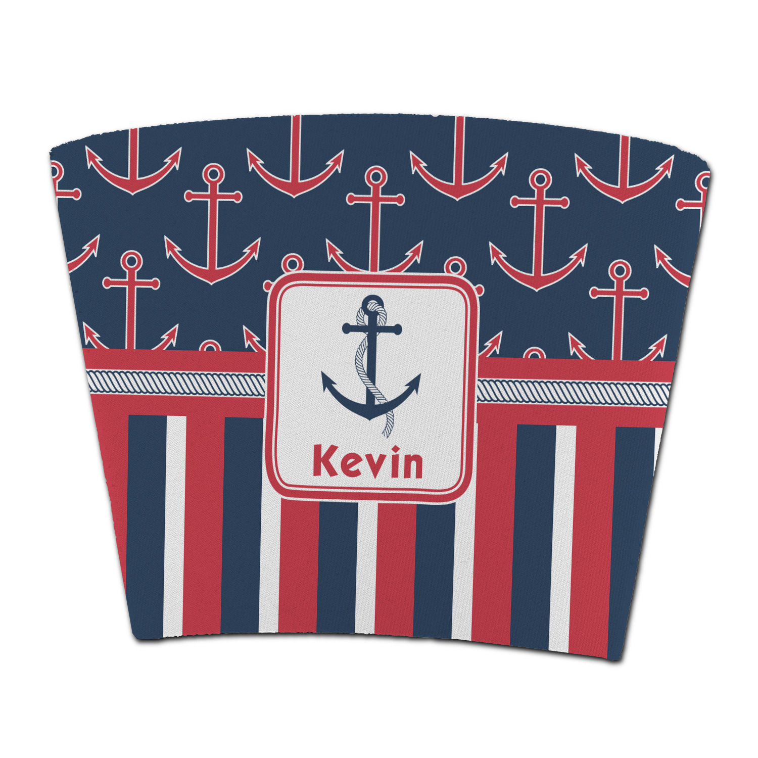 This nautical design features anchor pattern on top and stripes on the bottom. We chose to use the classic navy, red and white colors for our design. We chose the ribbon with rope, along with a squarish frame that contains a graphic and text. We use the anchor with rope for our graphic and a name for our text / personalization.
