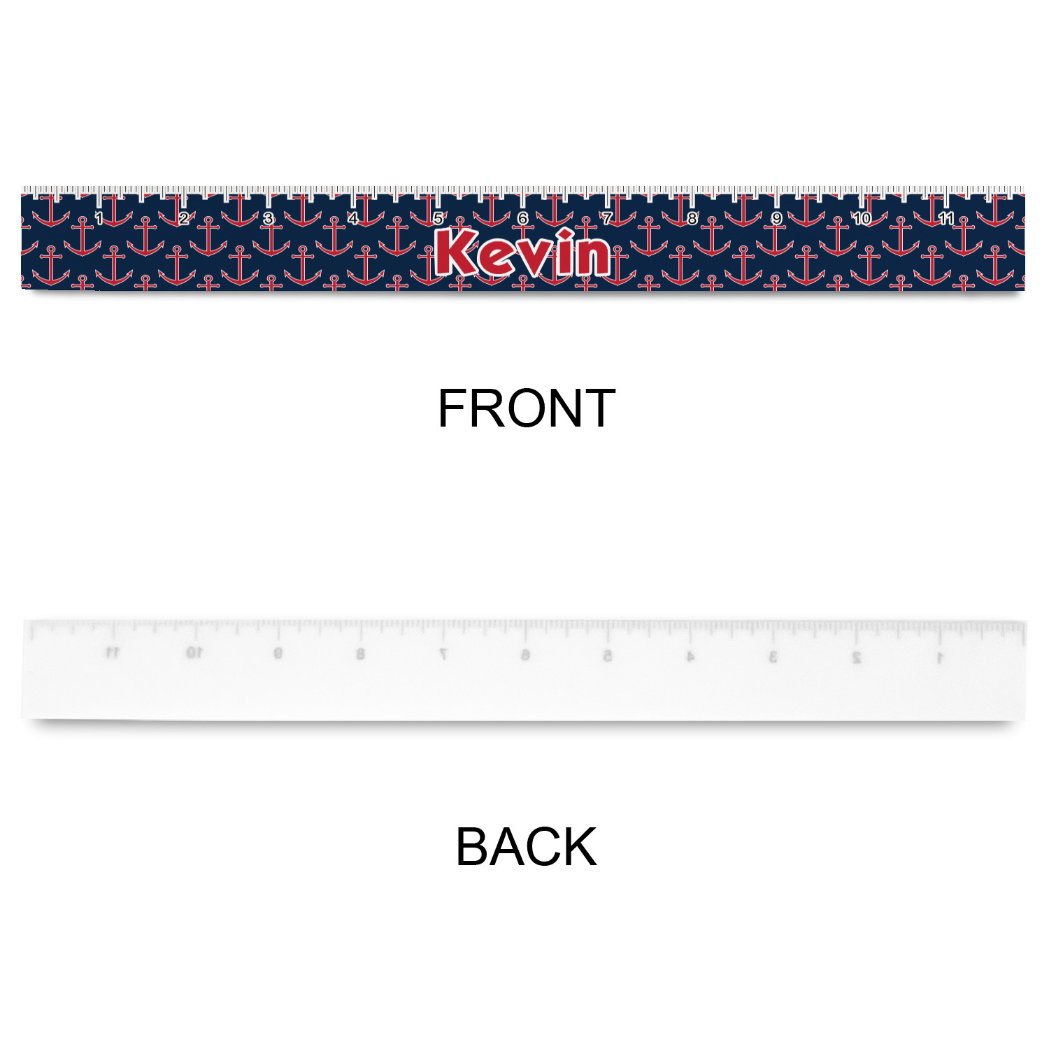 This nautical design features anchor pattern on top and stripes on the bottom. We chose to use the classic navy, red and white colors for our design. We chose the ribbon with rope, along with a squarish frame that contains a graphic and text. We use the anchor with rope for our graphic and a name for our text / personalization.