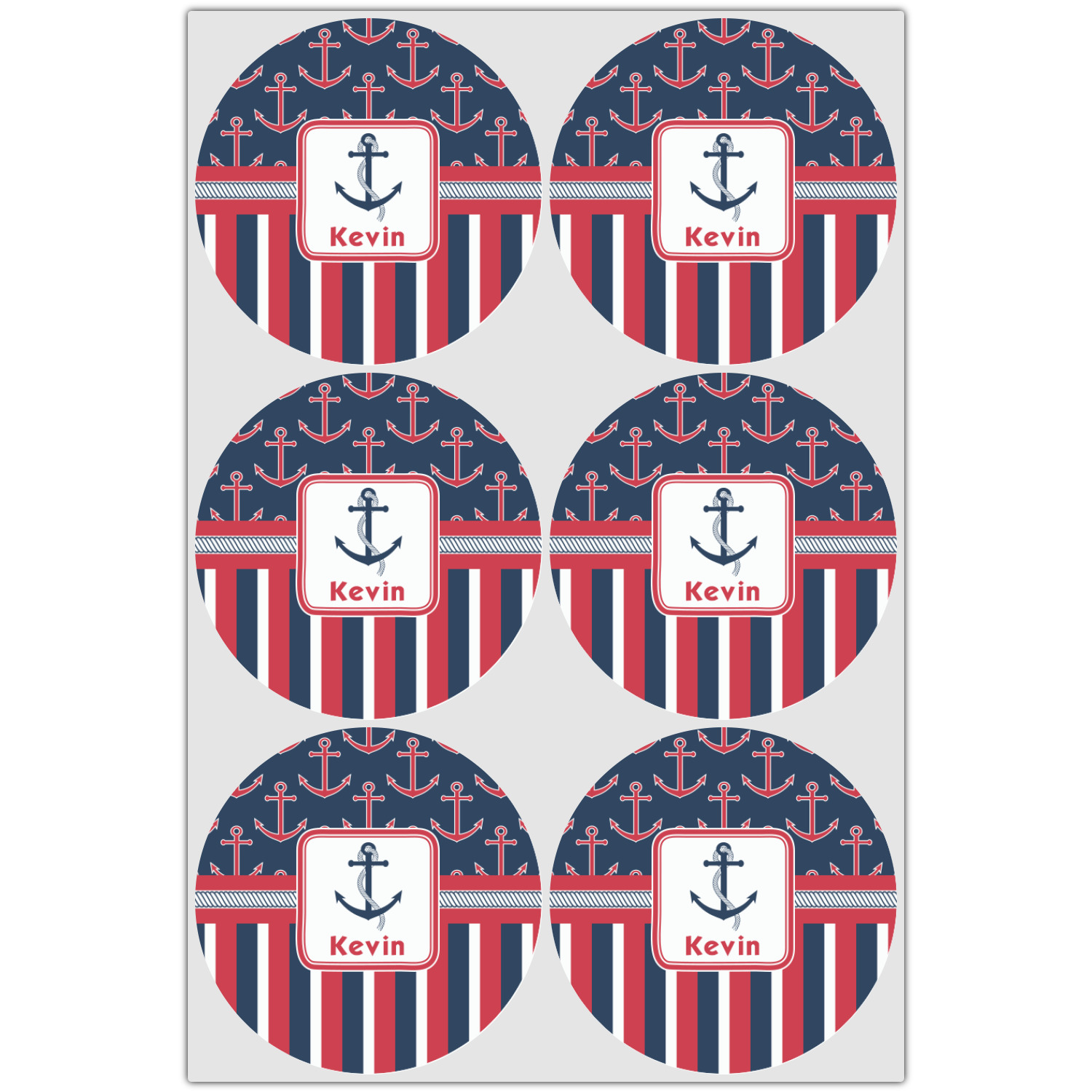 This nautical design features anchor pattern on top and stripes on the bottom. We chose to use the classic navy, red and white colors for our design. We chose the ribbon with rope, along with a squarish frame that contains a graphic and text. We use the anchor with rope for our graphic and a name for our text / personalization.