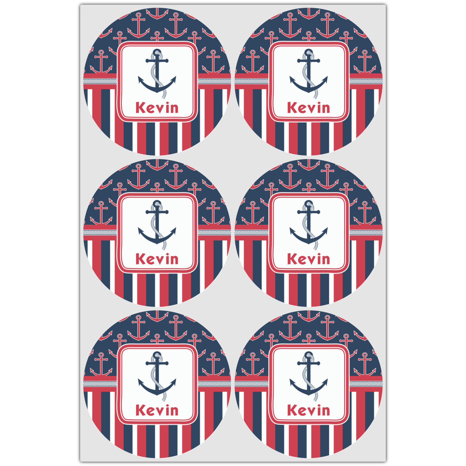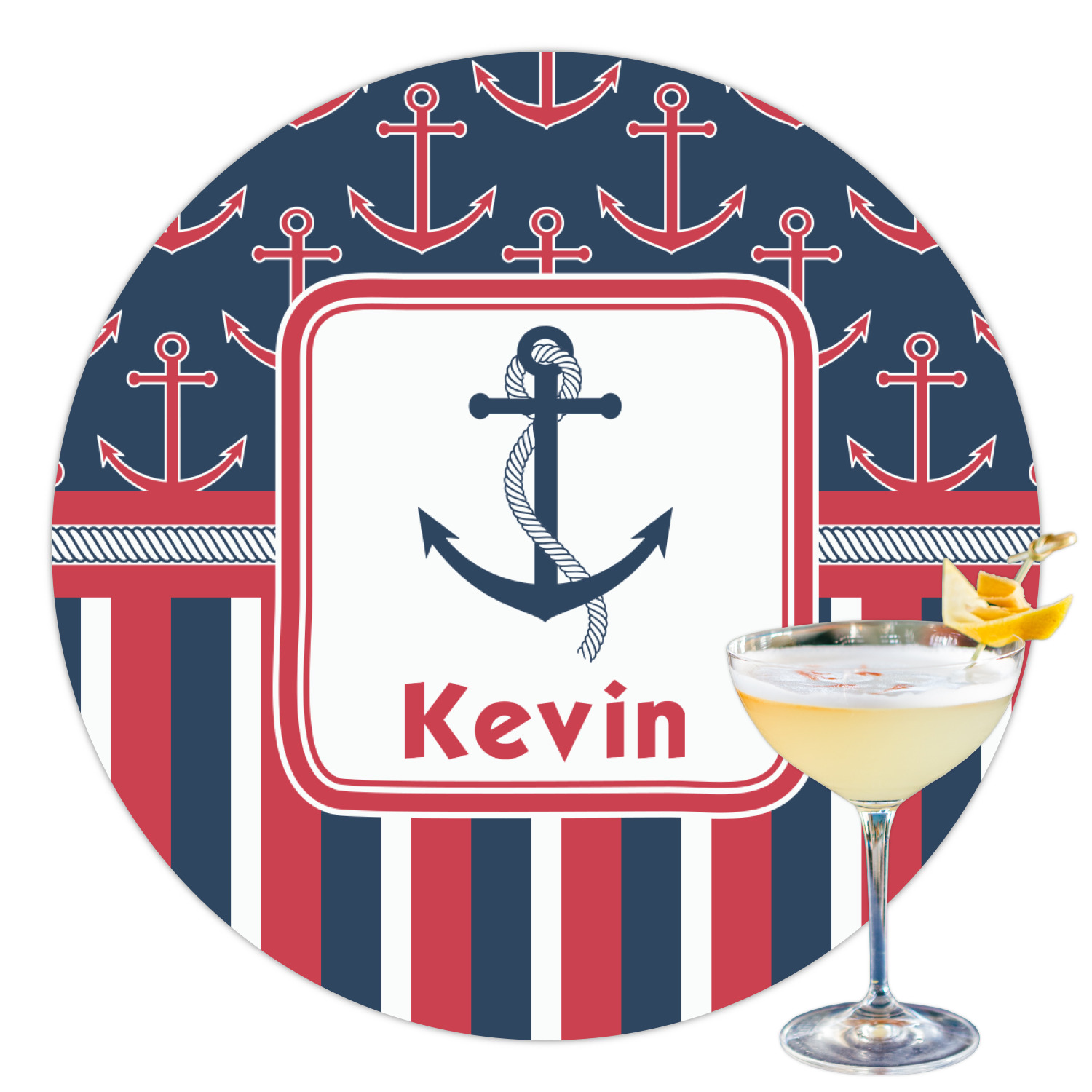 This nautical design features anchor pattern on top and stripes on the bottom. We chose to use the classic navy, red and white colors for our design. We chose the ribbon with rope, along with a squarish frame that contains a graphic and text. We use the anchor with rope for our graphic and a name for our text / personalization.