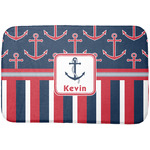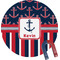 This nautical design features anchor pattern on top and stripes on the bottom. We chose to use the classic navy, red and white colors for our design. We chose the ribbon with rope, along with a squarish frame that contains a graphic and text. We use the anchor with rope for our graphic and a name for our text / personalization.