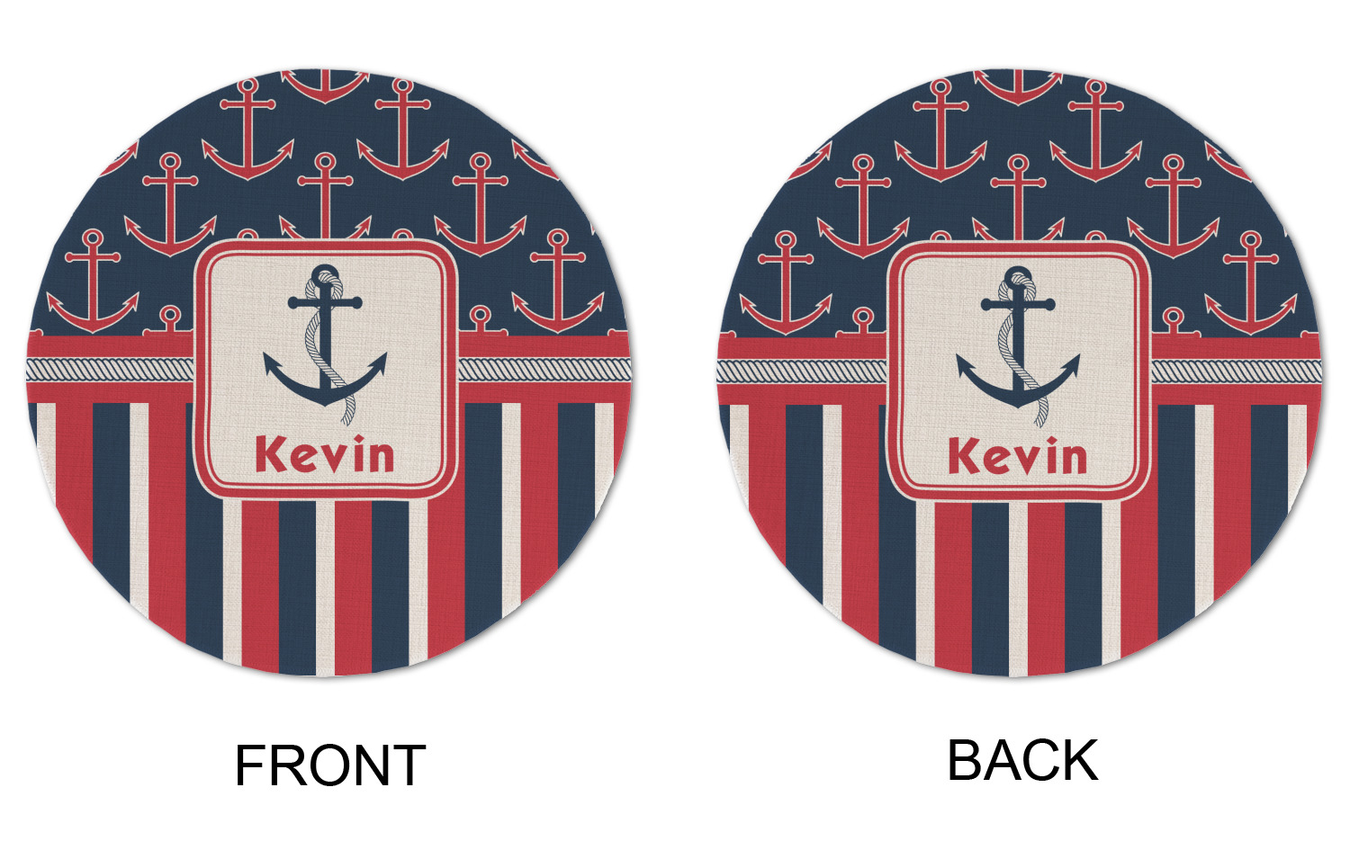 This nautical design features anchor pattern on top and stripes on the bottom. We chose to use the classic navy, red and white colors for our design. We chose the ribbon with rope, along with a squarish frame that contains a graphic and text. We use the anchor with rope for our graphic and a name for our text / personalization.