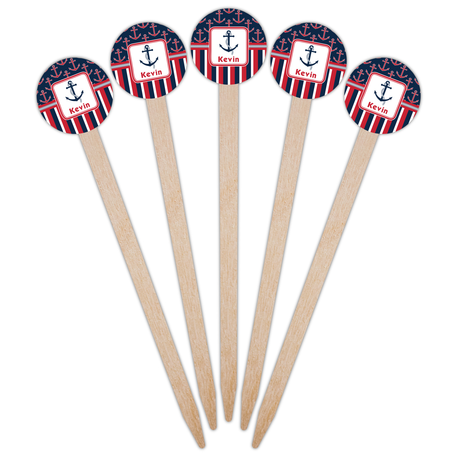 This nautical design features anchor pattern on top and stripes on the bottom. We chose to use the classic navy, red and white colors for our design. We chose the ribbon with rope, along with a squarish frame that contains a graphic and text. We use the anchor with rope for our graphic and a name for our text / personalization.