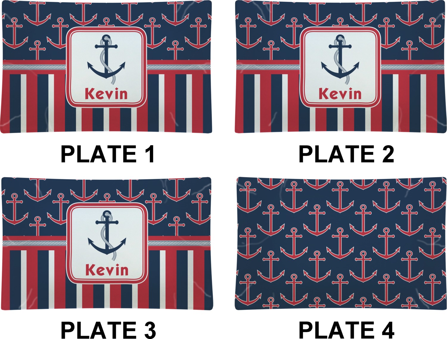 This nautical design features anchor pattern on top and stripes on the bottom. We chose to use the classic navy, red and white colors for our design. We chose the ribbon with rope, along with a squarish frame that contains a graphic and text. We use the anchor with rope for our graphic and a name for our text / personalization.