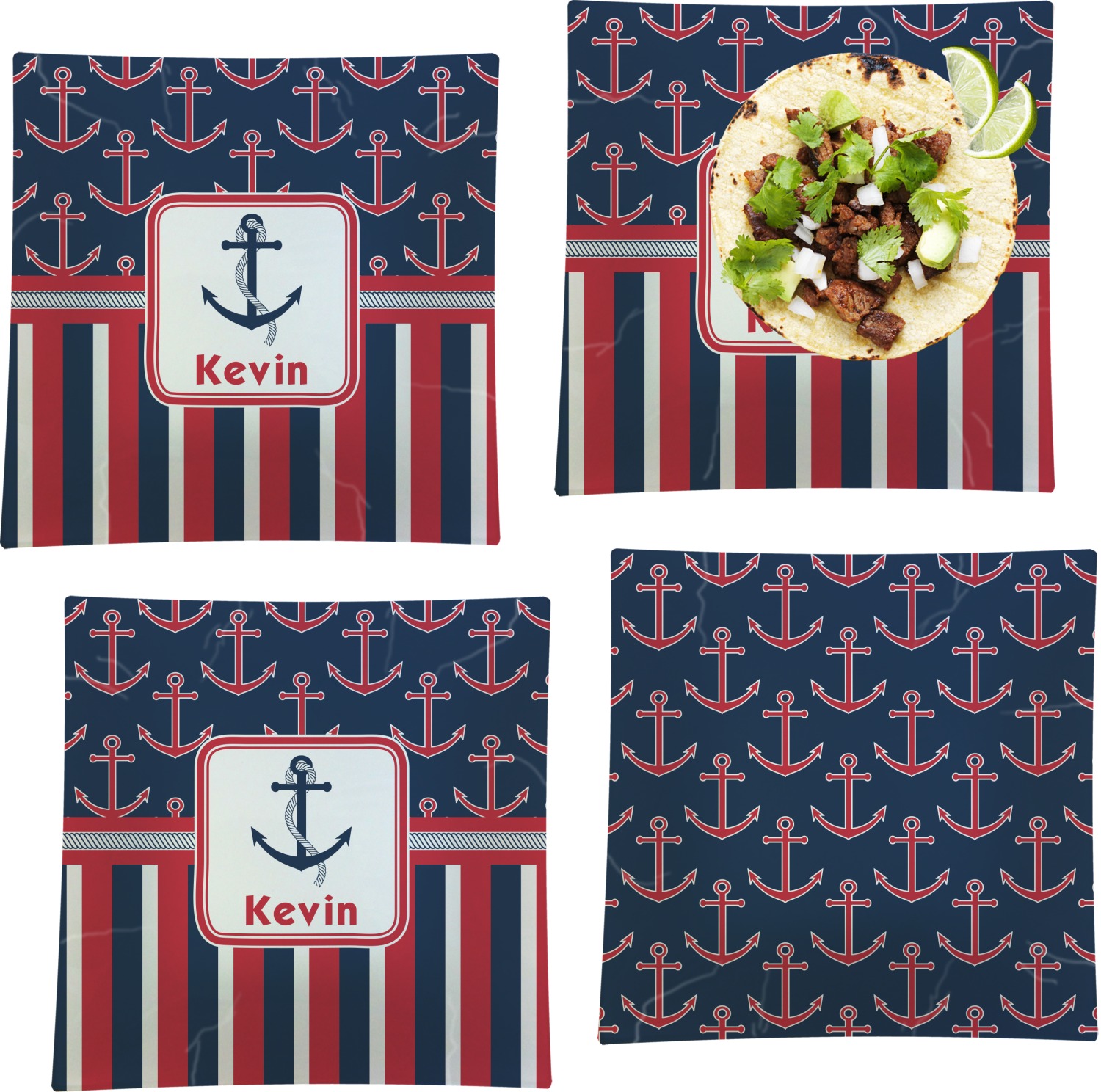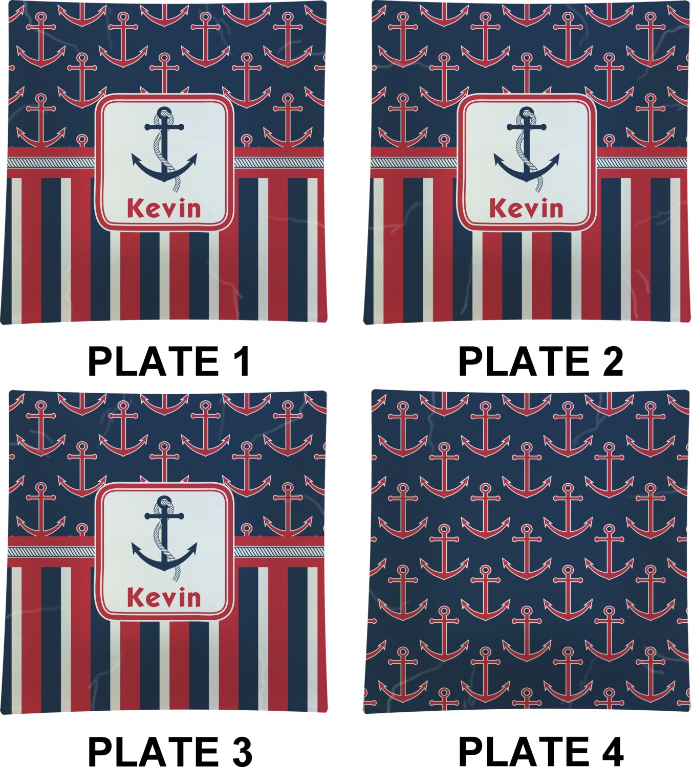 This nautical design features anchor pattern on top and stripes on the bottom. We chose to use the classic navy, red and white colors for our design. We chose the ribbon with rope, along with a squarish frame that contains a graphic and text. We use the anchor with rope for our graphic and a name for our text / personalization.