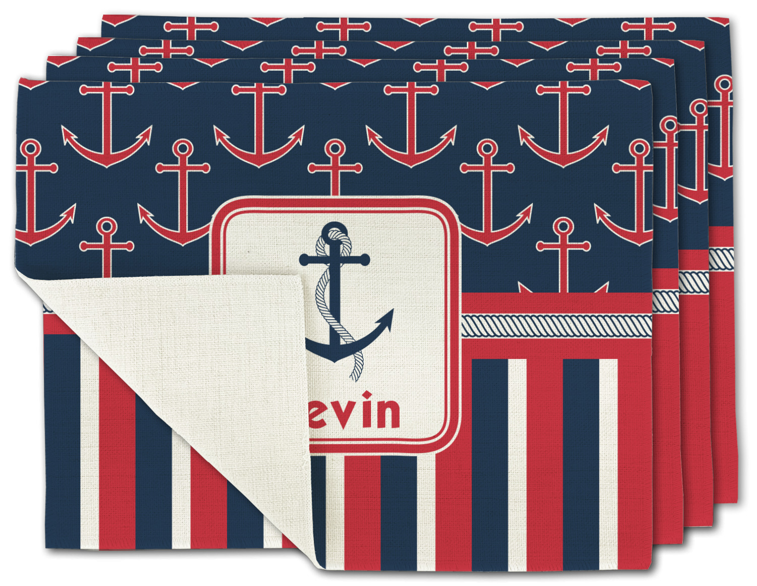 This nautical design features anchor pattern on top and stripes on the bottom. We chose to use the classic navy, red and white colors for our design. We chose the ribbon with rope, along with a squarish frame that contains a graphic and text. We use the anchor with rope for our graphic and a name for our text / personalization.