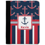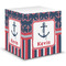This nautical design features anchor pattern on top and stripes on the bottom. We chose to use the classic navy, red and white colors for our design. We chose the ribbon with rope, along with a squarish frame that contains a graphic and text. We use the anchor with rope for our graphic and a name for our text / personalization.