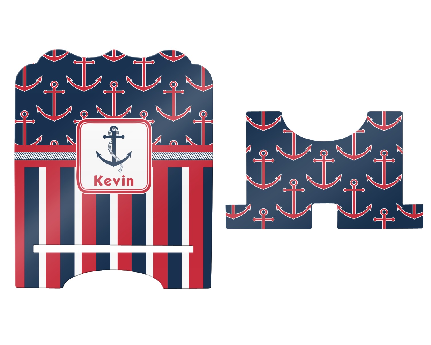 This nautical design features anchor pattern on top and stripes on the bottom. We chose to use the classic navy, red and white colors for our design. We chose the ribbon with rope, along with a squarish frame that contains a graphic and text. We use the anchor with rope for our graphic and a name for our text / personalization.