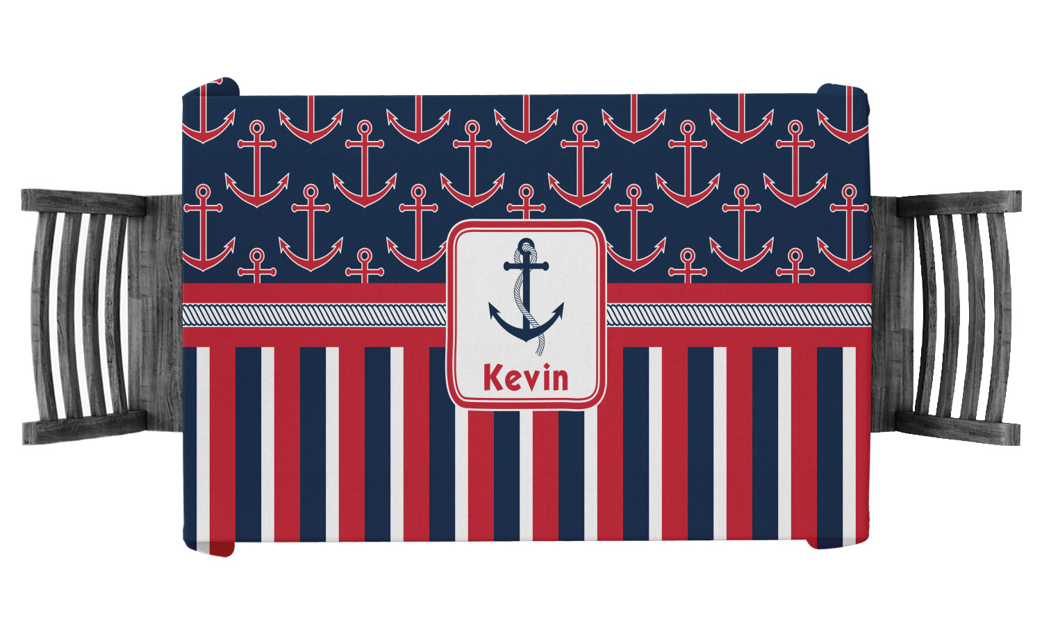 This nautical design features anchor pattern on top and stripes on the bottom. We chose to use the classic navy, red and white colors for our design. We chose the ribbon with rope, along with a squarish frame that contains a graphic and text. We use the anchor with rope for our graphic and a name for our text / personalization.