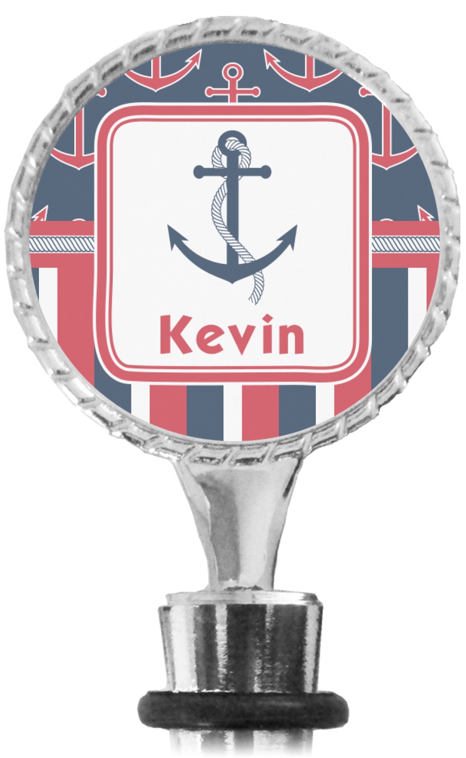 The top part of your bottle stopper is comprised of a zinc ring that displays your customization(s) in its middle, on both sides. The ring is heavy duty, with a bright chrome finish. The body of the wine stoppers have two silicone rings to provide an airtight seal. These wine bottle stoppers measure at 1.625" L x 0.8125" W x 4.625" H; your custom wine stopper is meant to fit into most standard-sized wine bottles.