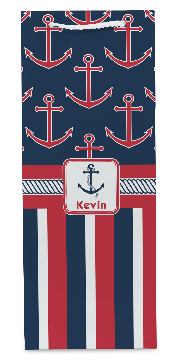 This nautical design features anchor pattern on top and stripes on the bottom. We chose to use the classic navy, red and white colors for our design. We chose the ribbon with rope, along with a squarish frame that contains a graphic and text. We use the anchor with rope for our graphic and a name for our text / personalization.