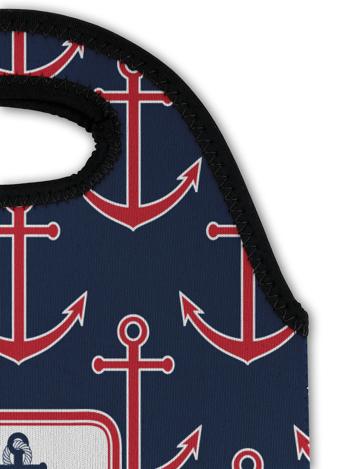 This nautical design features anchor pattern on top and stripes on the bottom. We chose to use the classic navy, red and white colors for our design. We chose the ribbon with rope, along with a squarish frame that contains a graphic and text. We use the anchor with rope for our graphic and a name for our text / personalization.