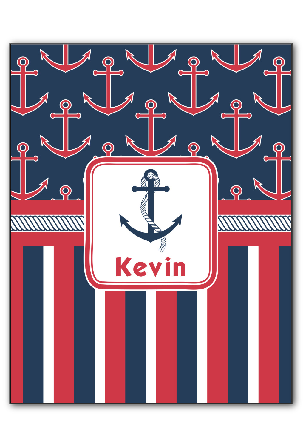This nautical design features anchor pattern on top and stripes on the bottom. We chose to use the classic navy, red and white colors for our design. We chose the ribbon with rope, along with a squarish frame that contains a graphic and text. We use the anchor with rope for our graphic and a name for our text / personalization.