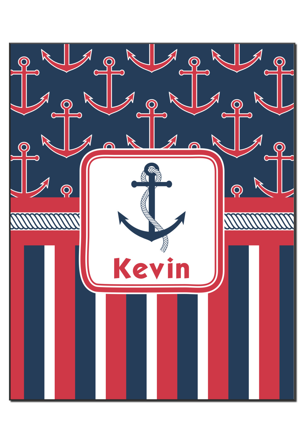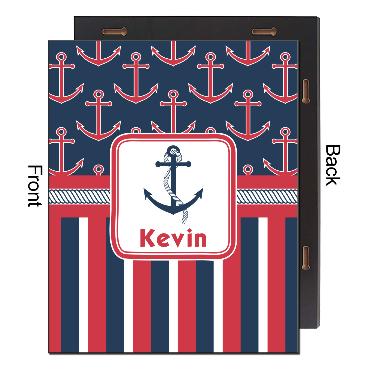 This nautical design features anchor pattern on top and stripes on the bottom. We chose to use the classic navy, red and white colors for our design. We chose the ribbon with rope, along with a squarish frame that contains a graphic and text. We use the anchor with rope for our graphic and a name for our text / personalization.