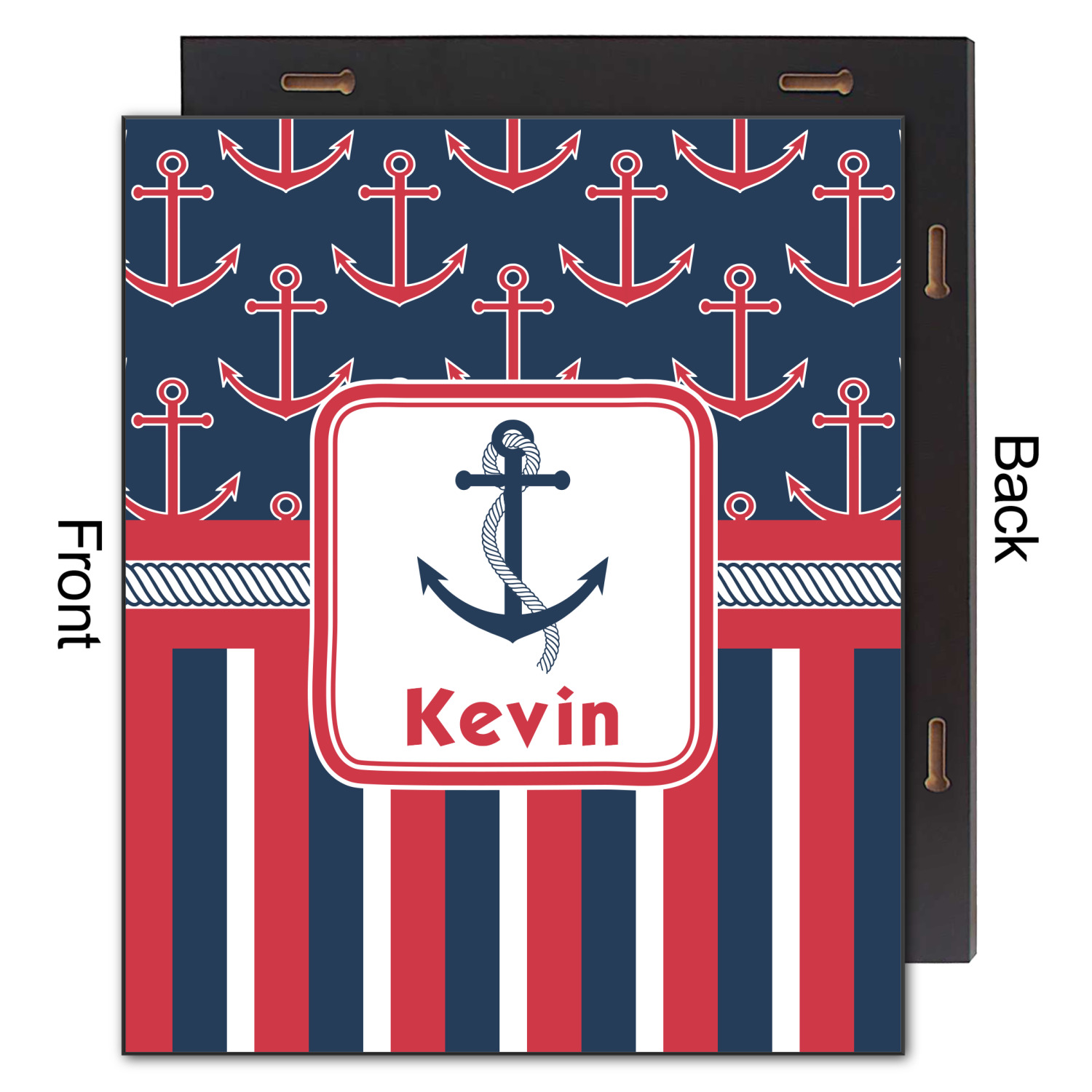 This nautical design features anchor pattern on top and stripes on the bottom. We chose to use the classic navy, red and white colors for our design. We chose the ribbon with rope, along with a squarish frame that contains a graphic and text. We use the anchor with rope for our graphic and a name for our text / personalization.