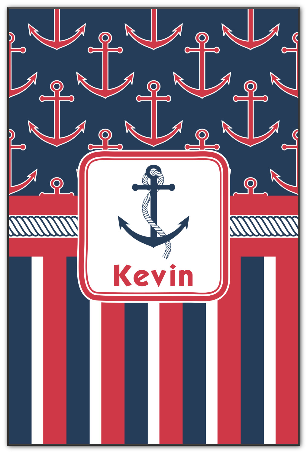 This nautical design features anchor pattern on top and stripes on the bottom. We chose to use the classic navy, red and white colors for our design. We chose the ribbon with rope, along with a squarish frame that contains a graphic and text. We use the anchor with rope for our graphic and a name for our text / personalization.