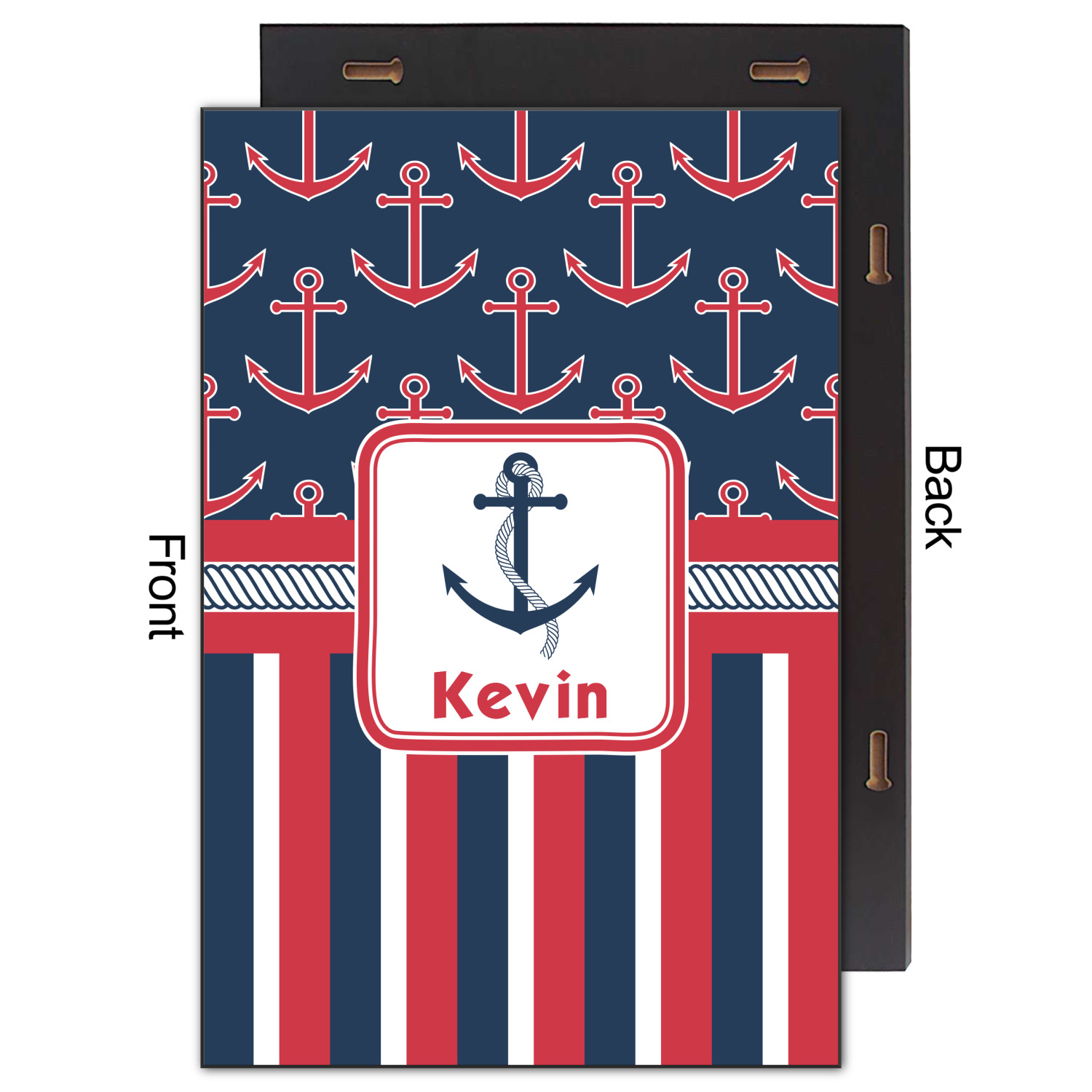 This nautical design features anchor pattern on top and stripes on the bottom. We chose to use the classic navy, red and white colors for our design. We chose the ribbon with rope, along with a squarish frame that contains a graphic and text. We use the anchor with rope for our graphic and a name for our text / personalization.