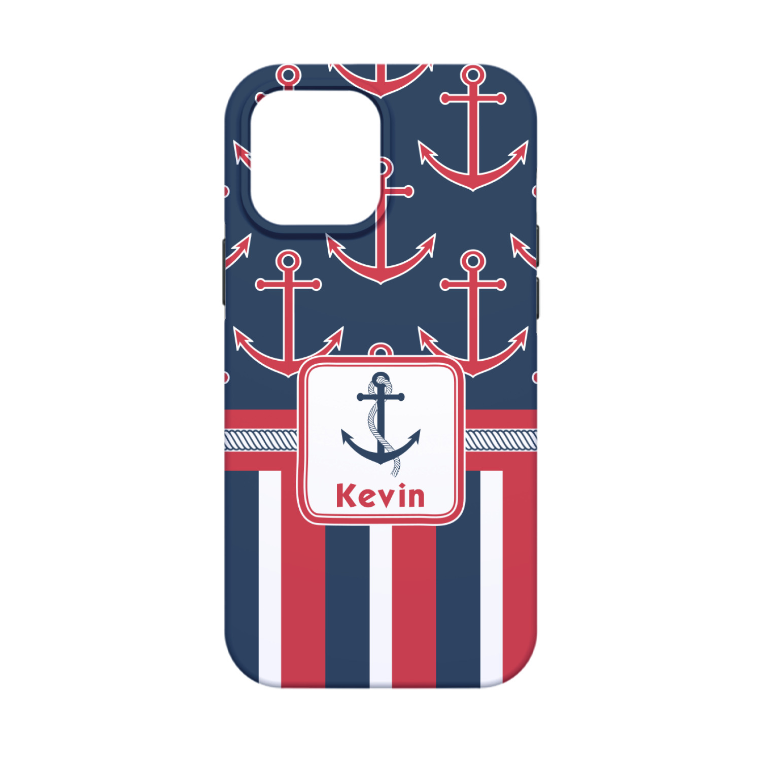 This nautical design features anchor pattern on top and stripes on the bottom. We chose to use the classic navy, red and white colors for our design. We chose the ribbon with rope, along with a squarish frame that contains a graphic and text. We use the anchor with rope for our graphic and a name for our text / personalization.