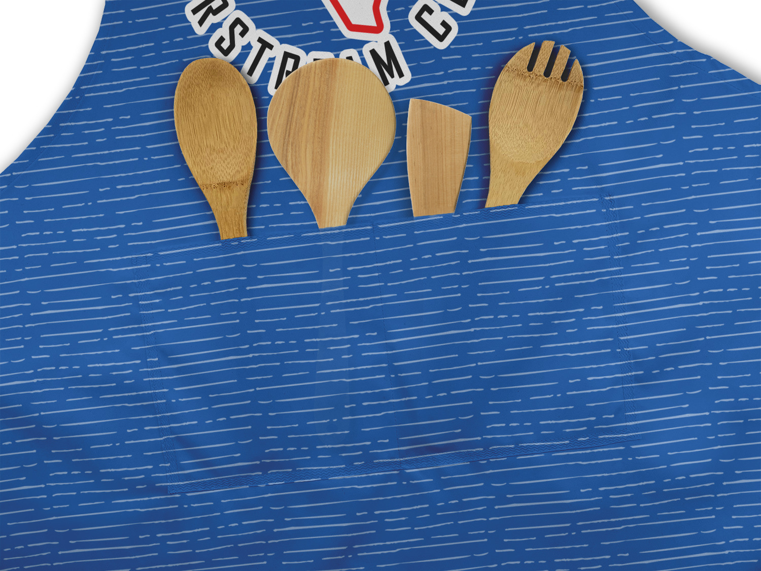 Our aprons are a lightweight yet durable polyester material. We offer two styles of aprons, one without pockets and one with two pockets adorning the center near the waistline. Each apron is one size* and comes with adjustable straps for both the neckline and waist. We print your custom design on the front of the apron to display your creativity!