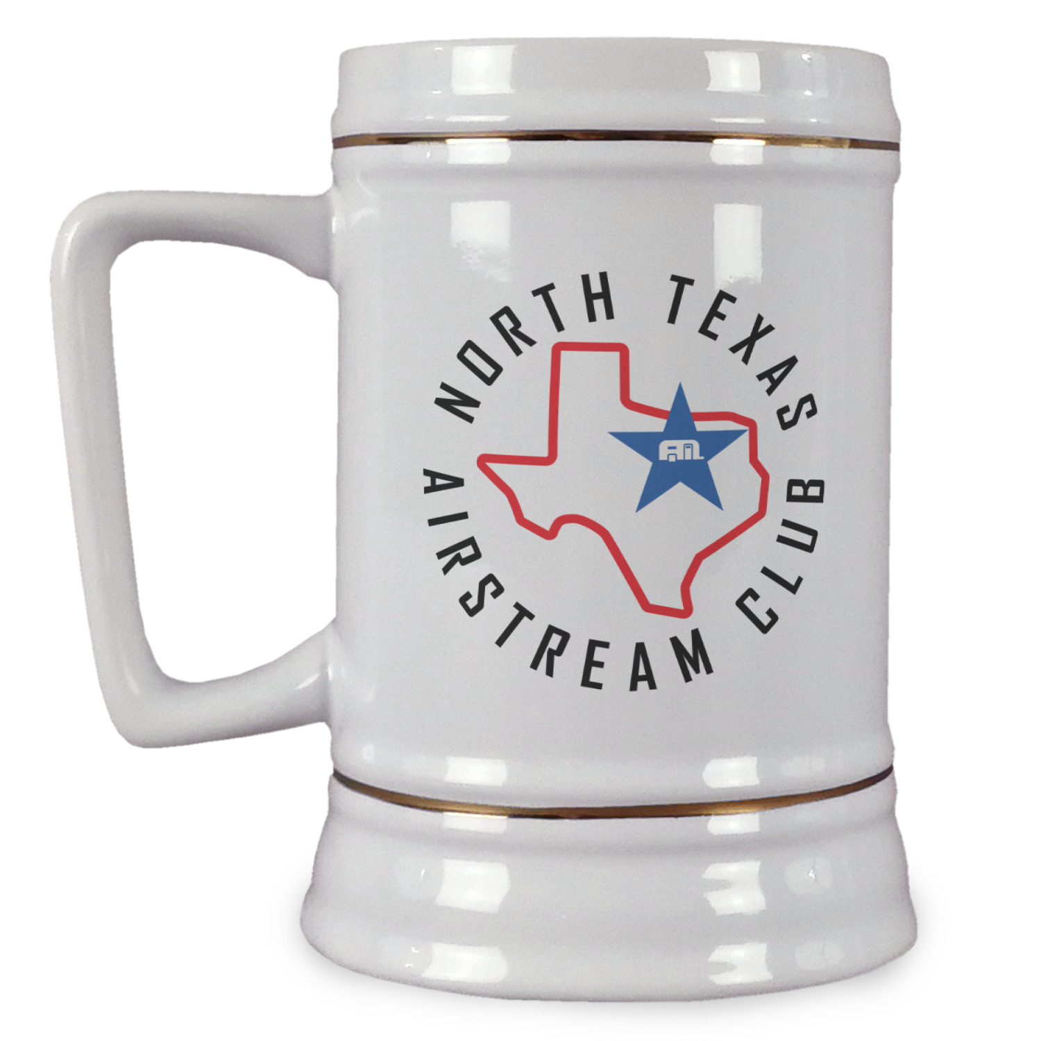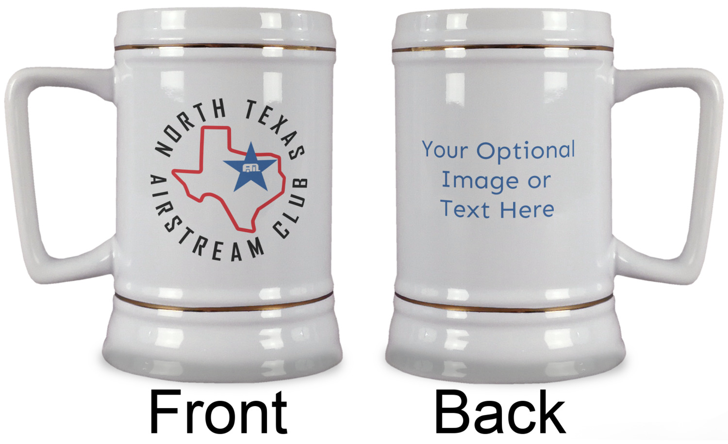 The beer steins are white in color, made from the highest quality ceramic and are approx. 5.5" tall with a top diameter of 3.5" and a bottom diameter of 4". They also have a D shaped handle that gives a modern touch to the classic European shaped beer stein. The beer steins also feature elegant gold pin stripes on the top and the bottom.