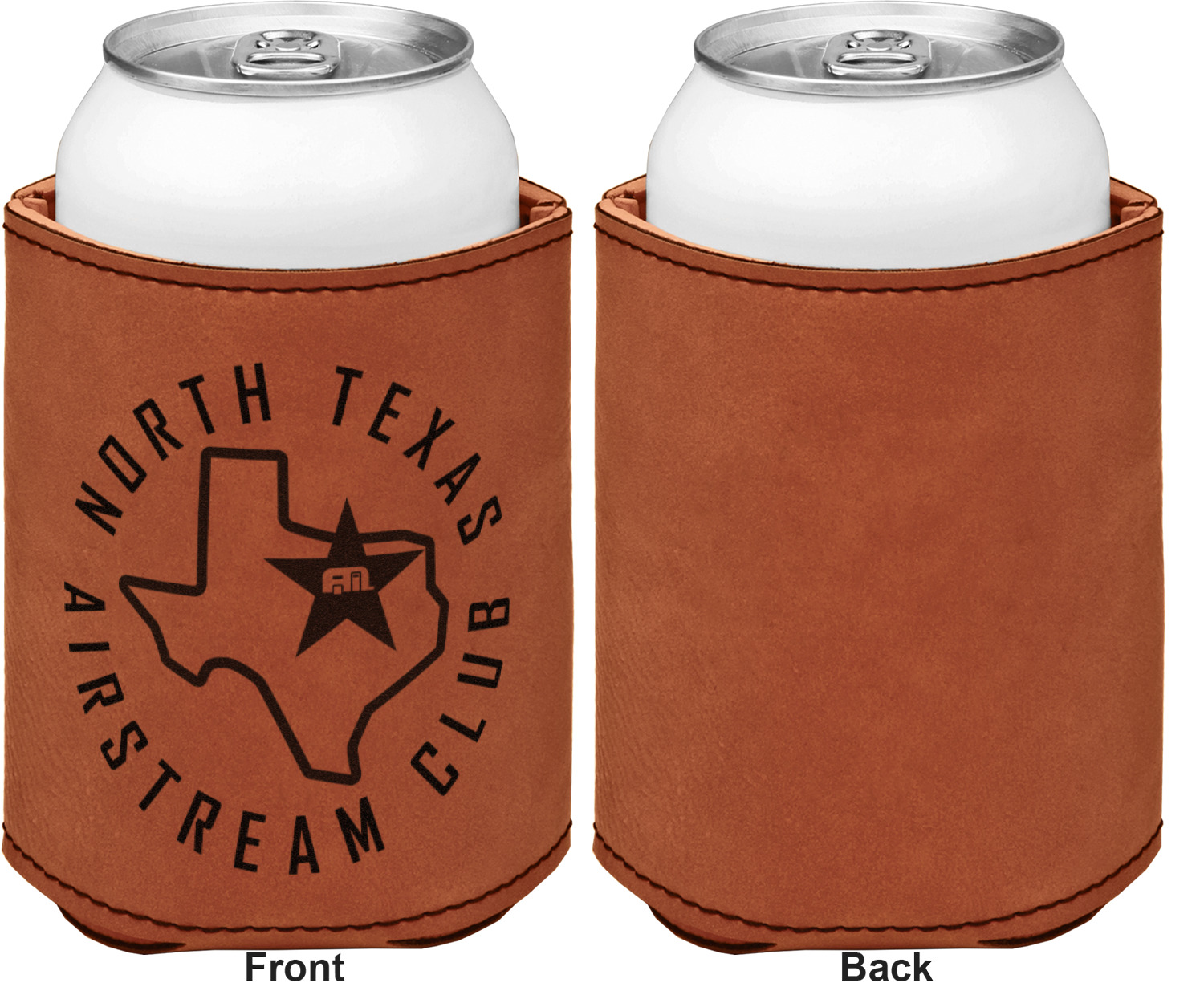 This can sleeve is made from a cognac-brown leatherette and stitched with a sturdy, black thread. A slim padding lines the inside of your can sleeve to allow for a better fit once your drink is inserted. The sleeve itself measures at 4 by 4.5 inches, allowing this custom can sleeve to accommodate most canned drinks. Your personalized design can be engraved on the front and back, or solely the front. When laser-engraved, your design appears as a black coloration which contrasts the leatherette nicely.