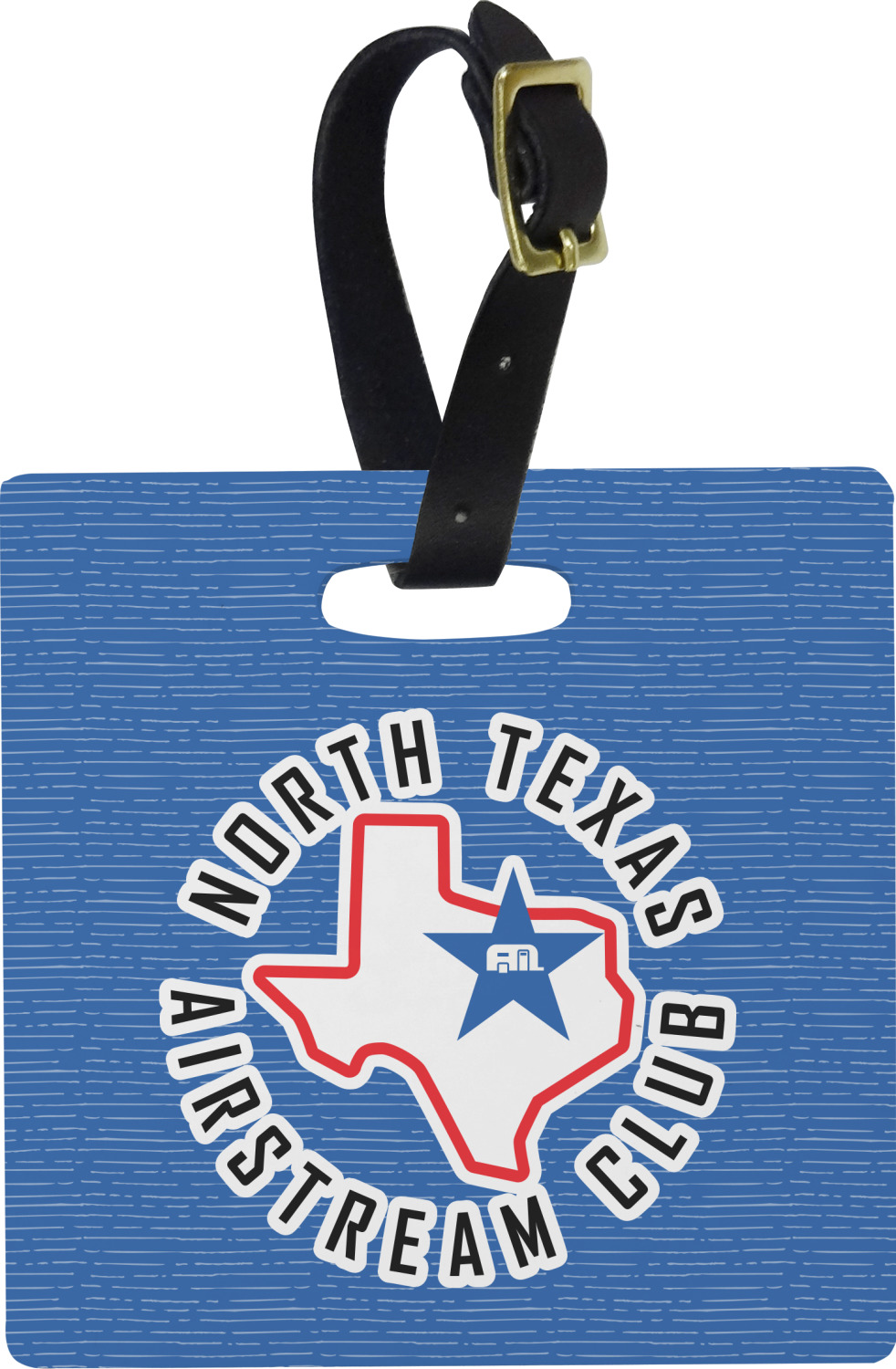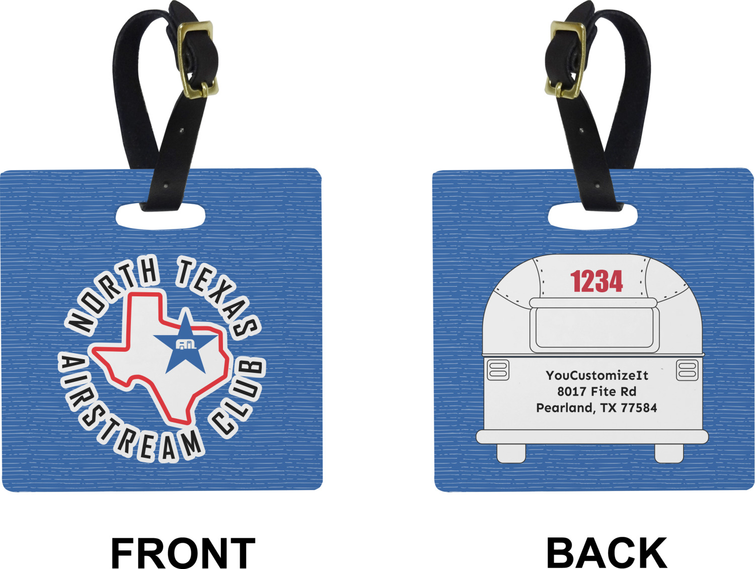 These personalized bag tags are sold in a variety of shapes, so that you may find the product that meets your vision exactly. We sell a round luggage tag, which measures at approximately 4" x 4". Our square luggage tag is about 3.5" x 3.5", while our rectangular version is 2.75" x 4 ".