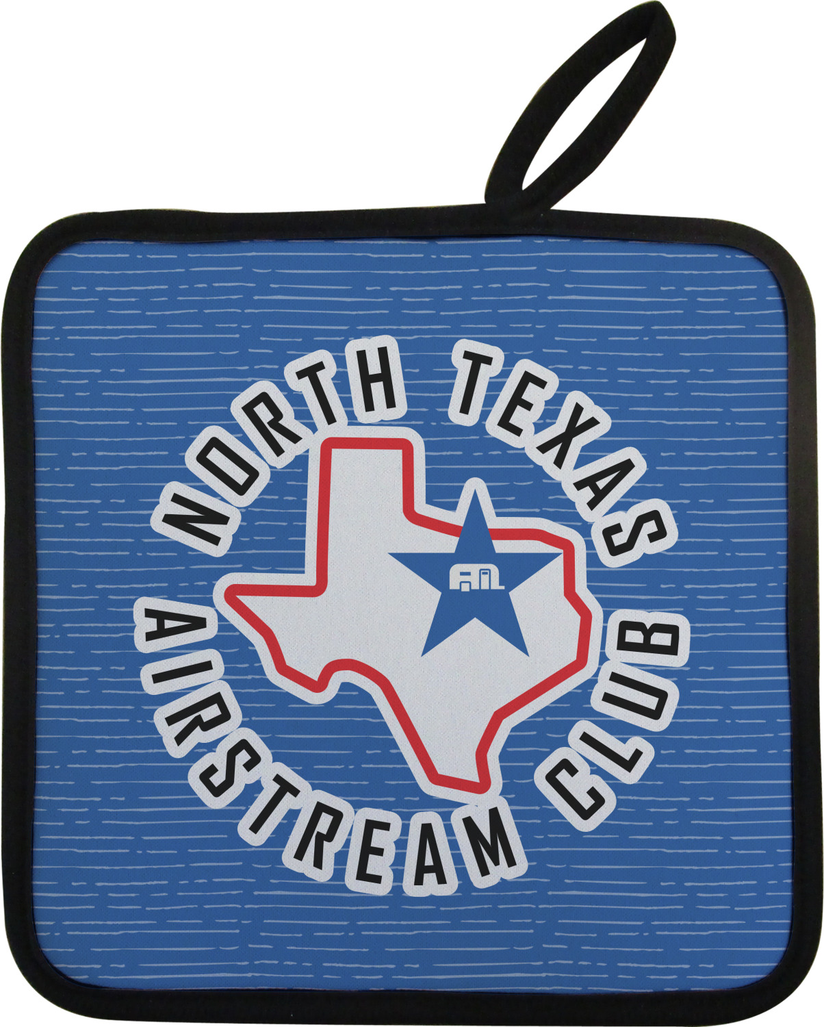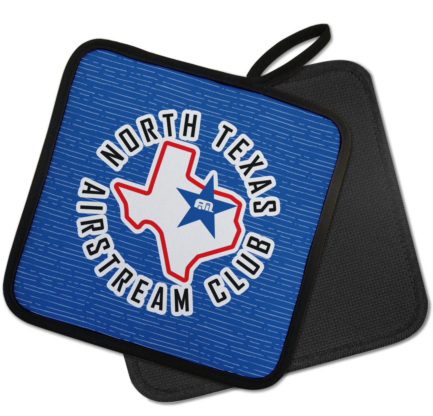 Our personalized pot holders feature a neoprene front that displays your personalization in vibrant colors. The backing of the hot pot holder is rubberized; the textured backing allows you to have a great grip when using this custom pot holder. The two materials are joined with a sleek, black trim, and the holder also includes an attached loop for hanging and storage. The pot holder is approximately 8.75 inches by 8.75 inches and 0.25 inches tall, while the fabric loop is 2.5 inches long. You can purchase a kitchen pot holder by itself or as a set of 2. We also offer a set including one pot holder and one oven mitt.