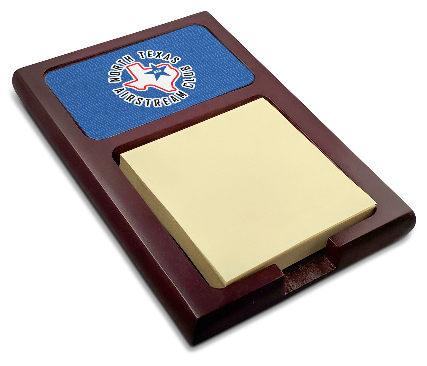 Crafted from a fine mahogany, this post it note holder is in the shade of a dark, cherry color. The dispenser itself is about 4.25 by 6.25 by 0.75 inches. You can place your 3 by 3 inch sticky notes in the indentation below the nameplate. We print your customization onto the nameplate that rests above the velvety indentation.