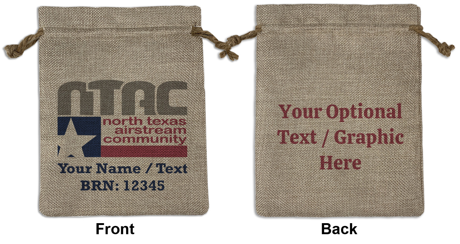 We sell our Burlap Gift Bags in 3 variant sized bags. Made with burlap polyester, each personalized bag can be secured with a twine drawstring pull. Your custom design is available to print on one side or both sides - completely up to you! The sizes of the bags measure approximately 4.5" x 6.5" for the smallest size, 6.5" x 8.0" for the medium size, and 6.5" x 13.5" for the large-sized bag.