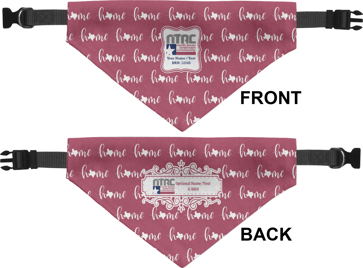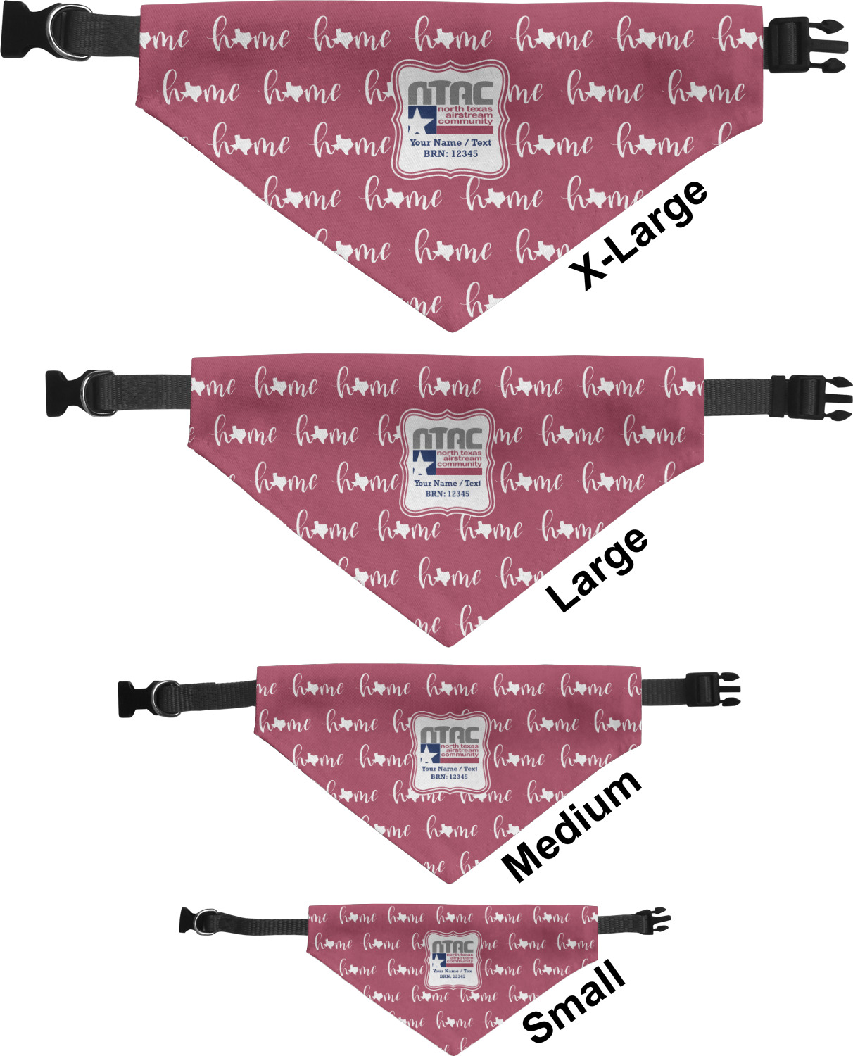We print the front and back of these dog bandanas with your customized design. The bandana itself is made from a durable polyester, sewn together with a gap large enough to accommodate any collar. Regardless, the bandana includes a plain black, canvas collar with plastic snaps, that can easily be removed if desired. These dog bandana collars are available in four sizes: small, medium, large, and extra large. Please see our sizing chart for more information regarding the dimensions of each size.