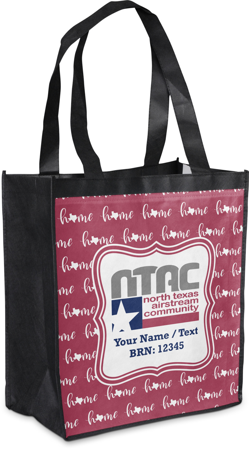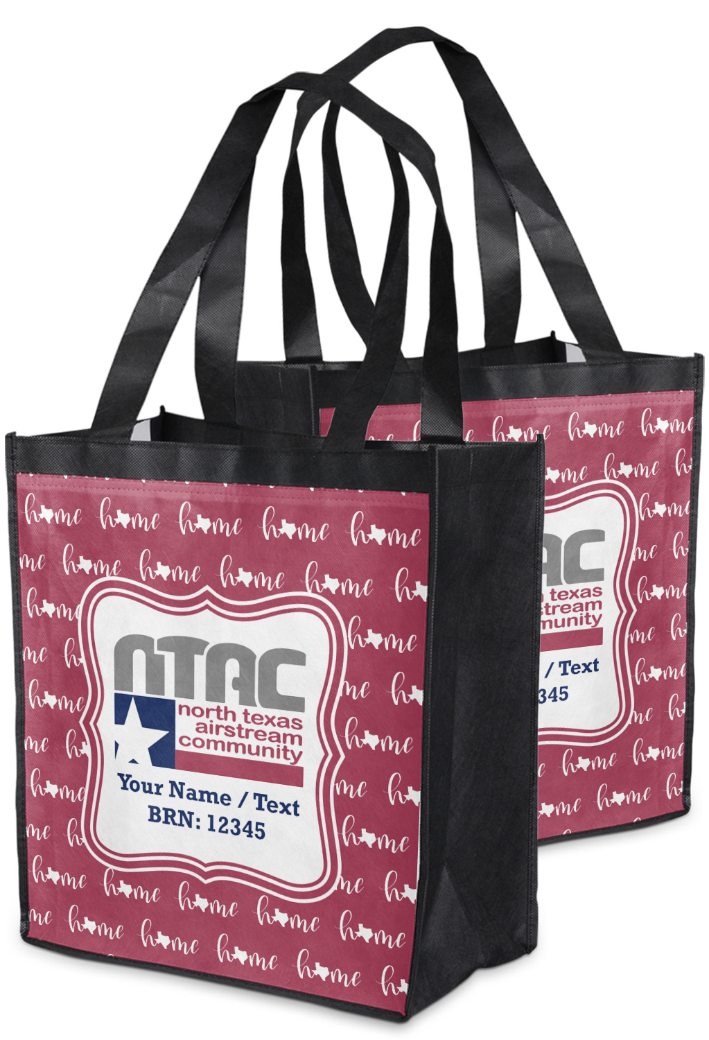 Made from a durable, biodegradable material, these reusable shopping bags can support up to 30 pounds of weight. With two large handles, measuring at 8.5 inches each, these personalized tote bags are easy to carry to your vehicle or home. The bag itself is 12 by 13.5 inches, and can expand to a depth of 7 inches. Your customization is printed on both the front and back, while the remaining sides, trim, and handle are a sleek, charcoal black.