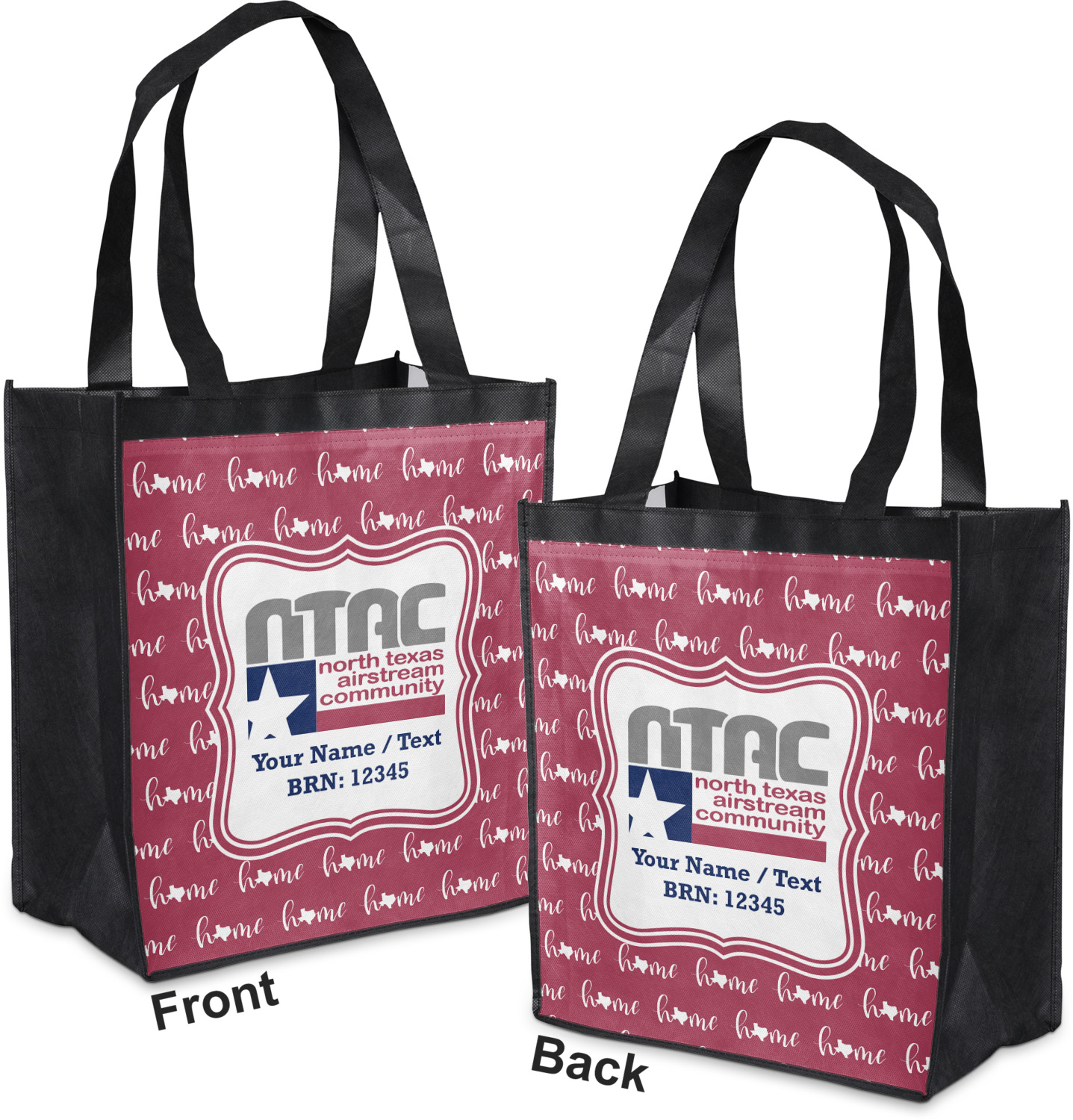 Made from a durable, biodegradable material, these reusable shopping bags can support up to 30 pounds of weight. With two large handles, measuring at 8.5 inches each, these personalized tote bags are easy to carry to your vehicle or home. The bag itself is 12 by 13.5 inches, and can expand to a depth of 7 inches. Your customization is printed on both the front and back, while the remaining sides, trim, and handle are a sleek, charcoal black.
