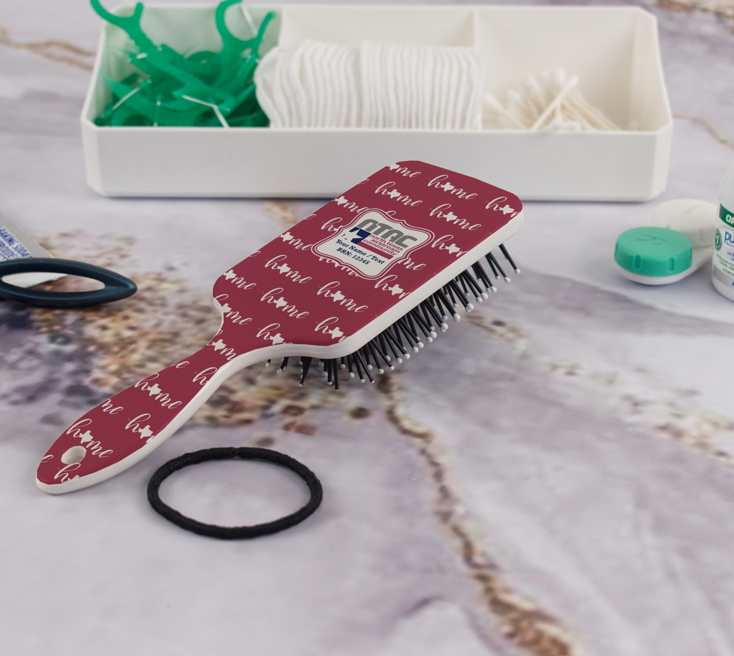 The brushes can be designed with a background that is a photo, artwork or a pattern. Content, such as your logo, photo, monogram, initial etc. can be optionally be added or removed.