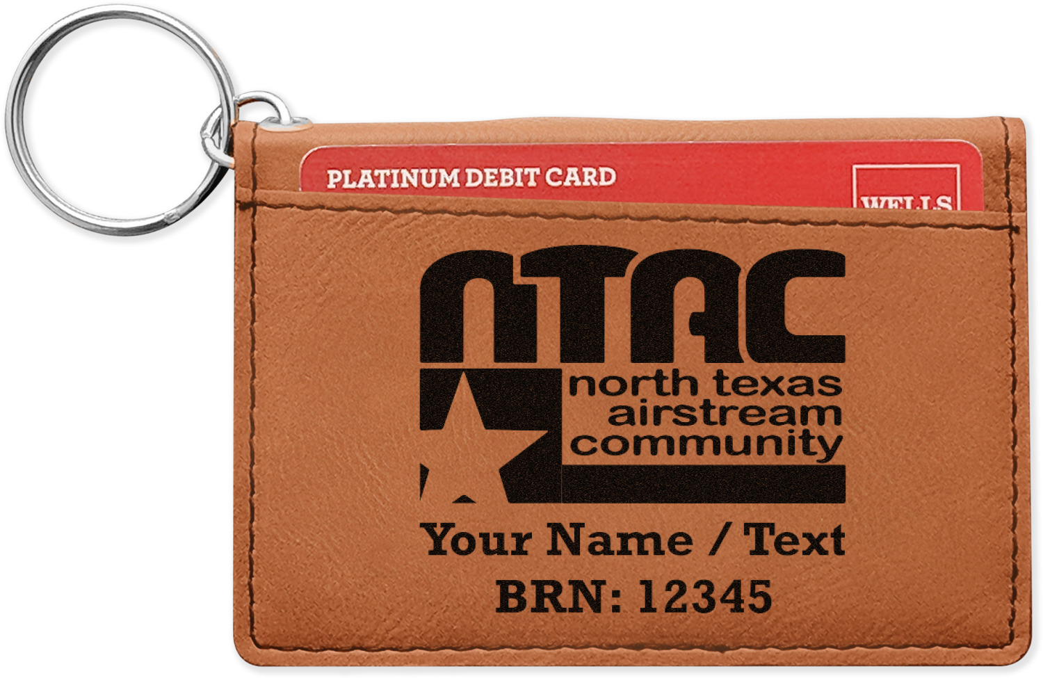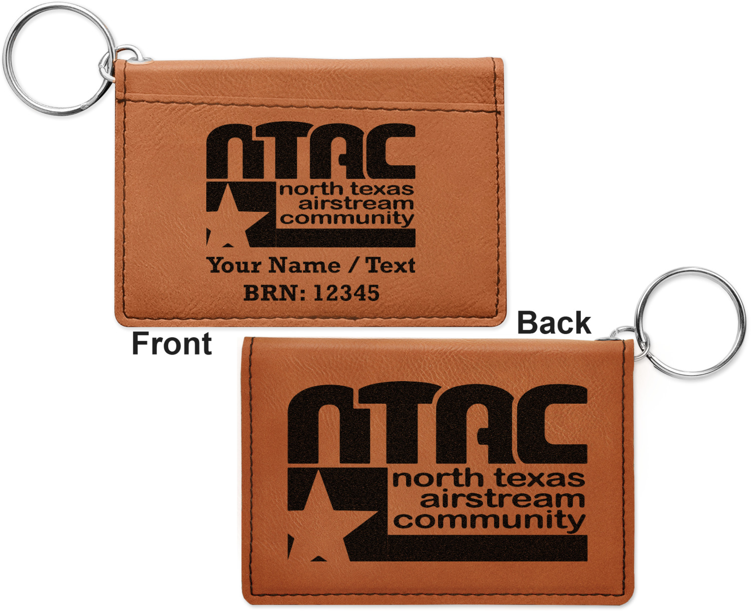 These ID wallet keychains features three pockets on the inside to accommodate your ID and your most frequently used cards. Another pocket occupies the front of the wallet's exterior, and can hold some cash or another card. The wallet is accompanied by a thick metal ring for easy attachment to a belt clip or purse. Each card holder keychain measures at 4.25 by 3 inches and is a beautiful, cognac, medium-brown shade. The personalized monogram, font, or graphic of your choosing is laser engraved into the surface of the wallet, creating a black imprint. We sell these ID wallets in two models: single sided and double sided engraving.