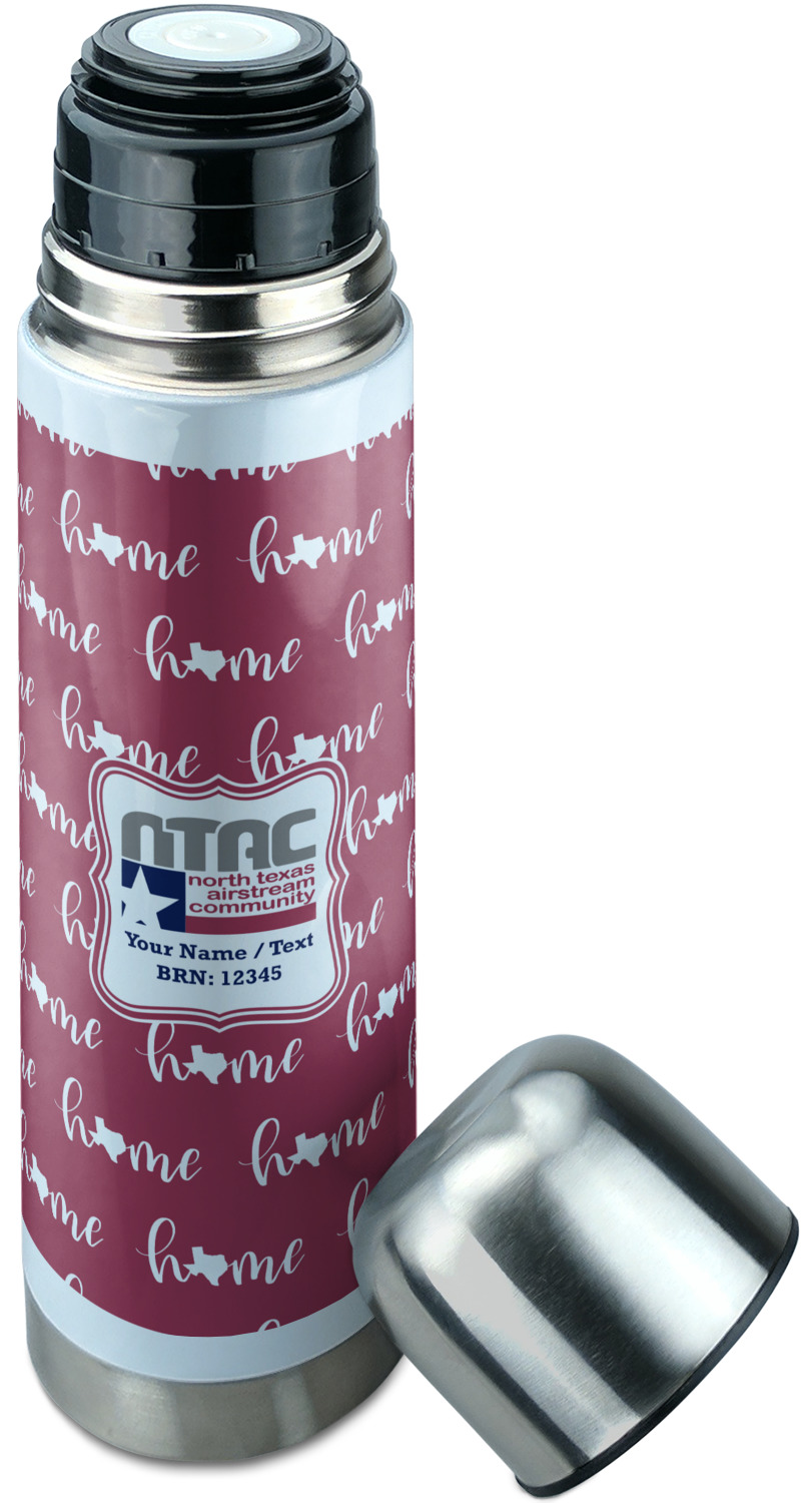 Manufactured from stainless steel, this thermos is built durably and double-walled insulated to preserve the temperature of your drink for hours. It also features a screw off lid that is made to also function as a small cup. Upon unscrewing this part of the thermos bottle, a pop-open, pour feature emerges. This feature allows you to slowly pour your beverage into your lid, ensuring a steady, controlled pour into your lid or other cup. With a capacity of 25 ounces, these large thermoses can hold several servings of your favorite beverage. Your customization is displayed all around the bottle with bright, vibrant color.