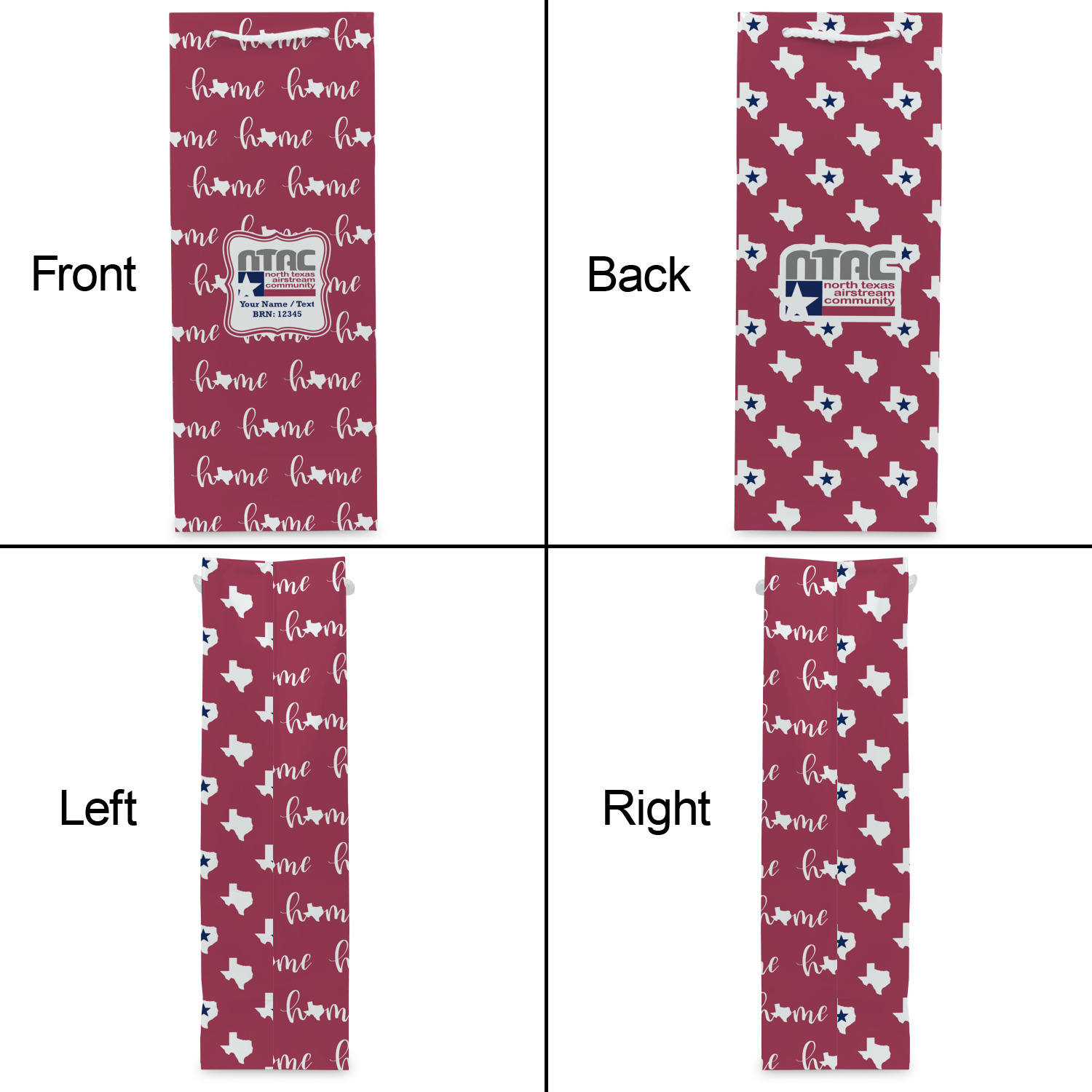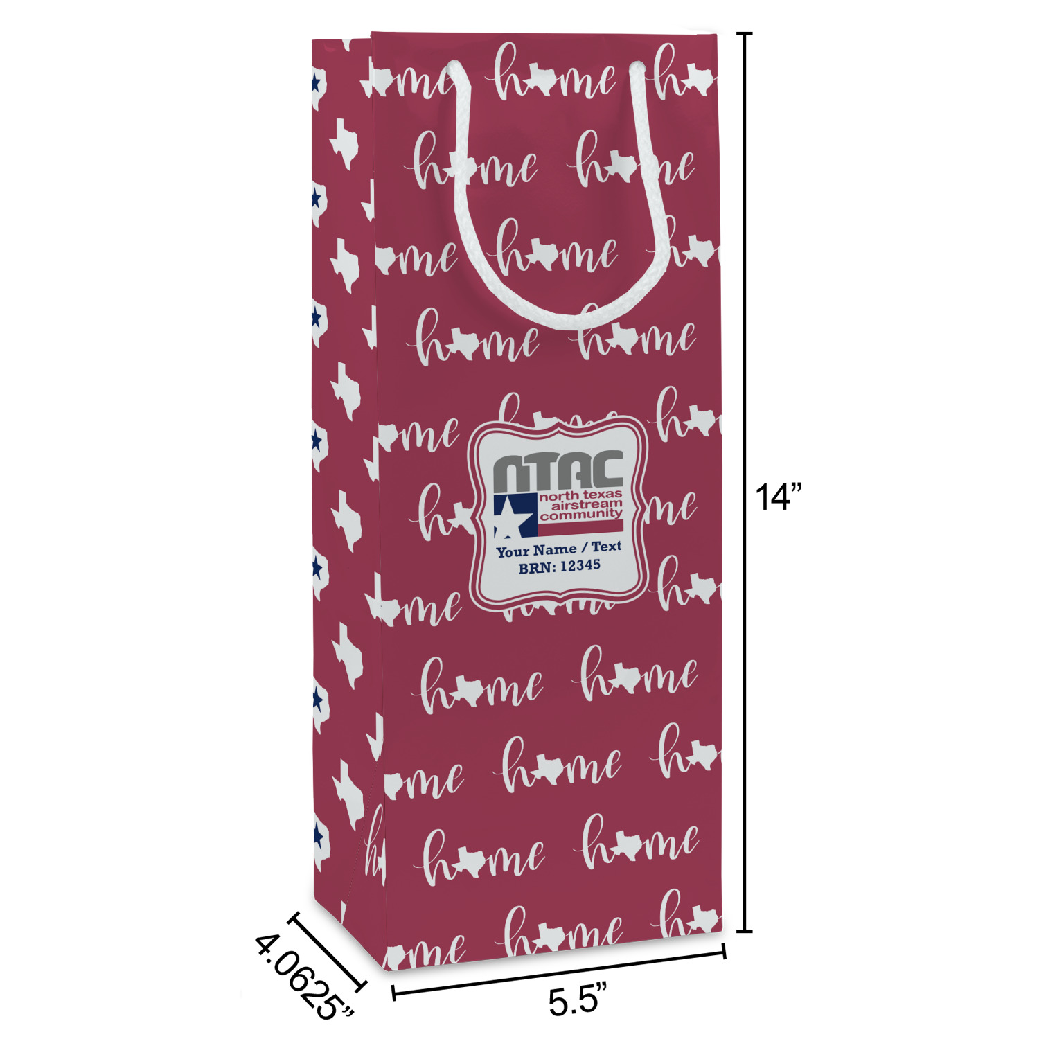Our wine bags are printed on premium paper. The bags are then cut, scored and folded. The handles and cardstock base it attached. These custom wine bags are printed and made in the USA.