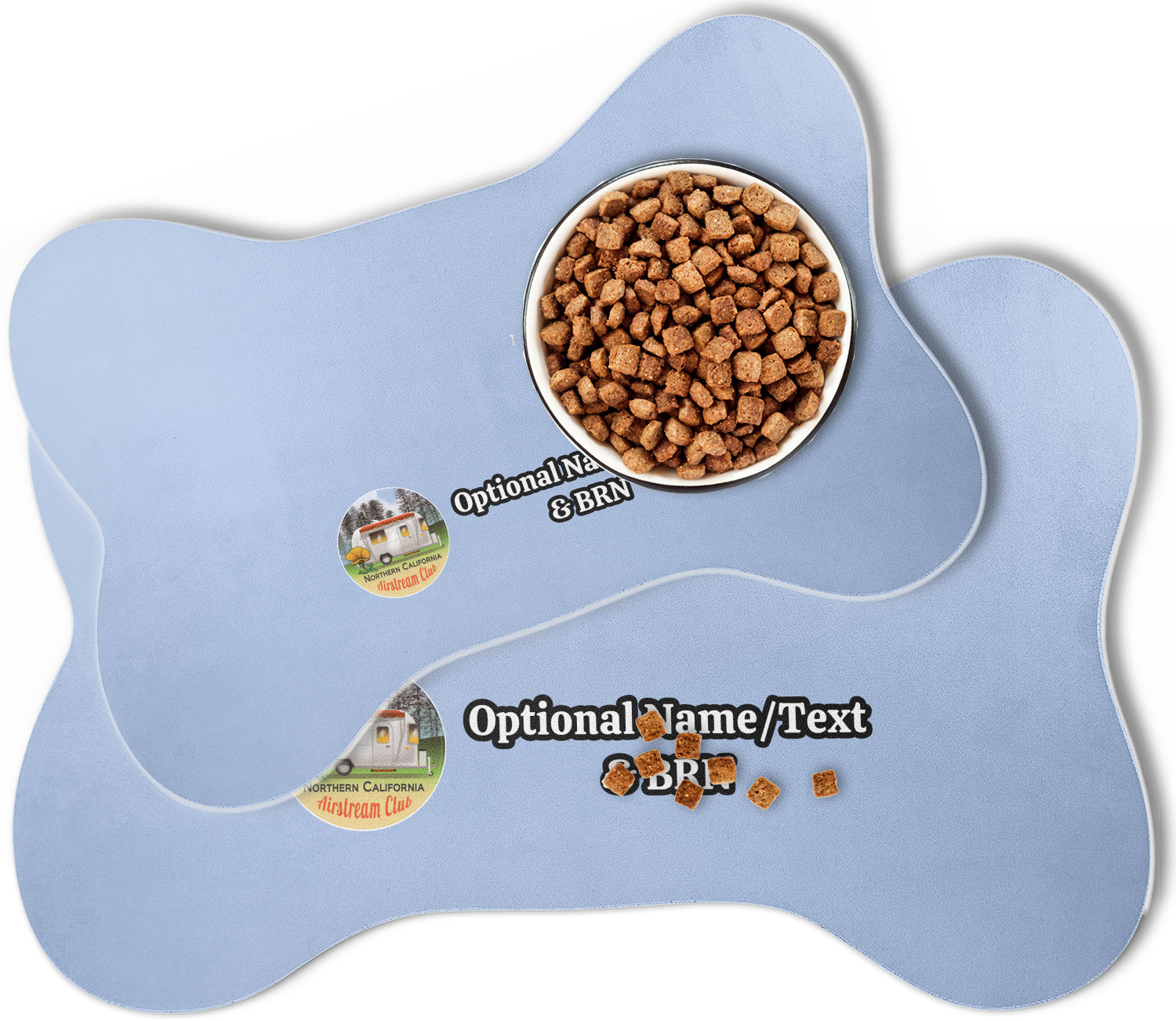 The top of this mat displays your custom design, as it is printed on polyester. To prevent slippage, the underside of the mat is made of rubber. We offer a small dog food mat, suitable for smaller dogs and a large dog food mat for bigger breeds. The small dog food mat is approximately 19 by 13 inches, while the large dog feeding mat measures at approximately 26.75 by 18 inches. Both personalized mats are ideally sized to fit two dog bowls.