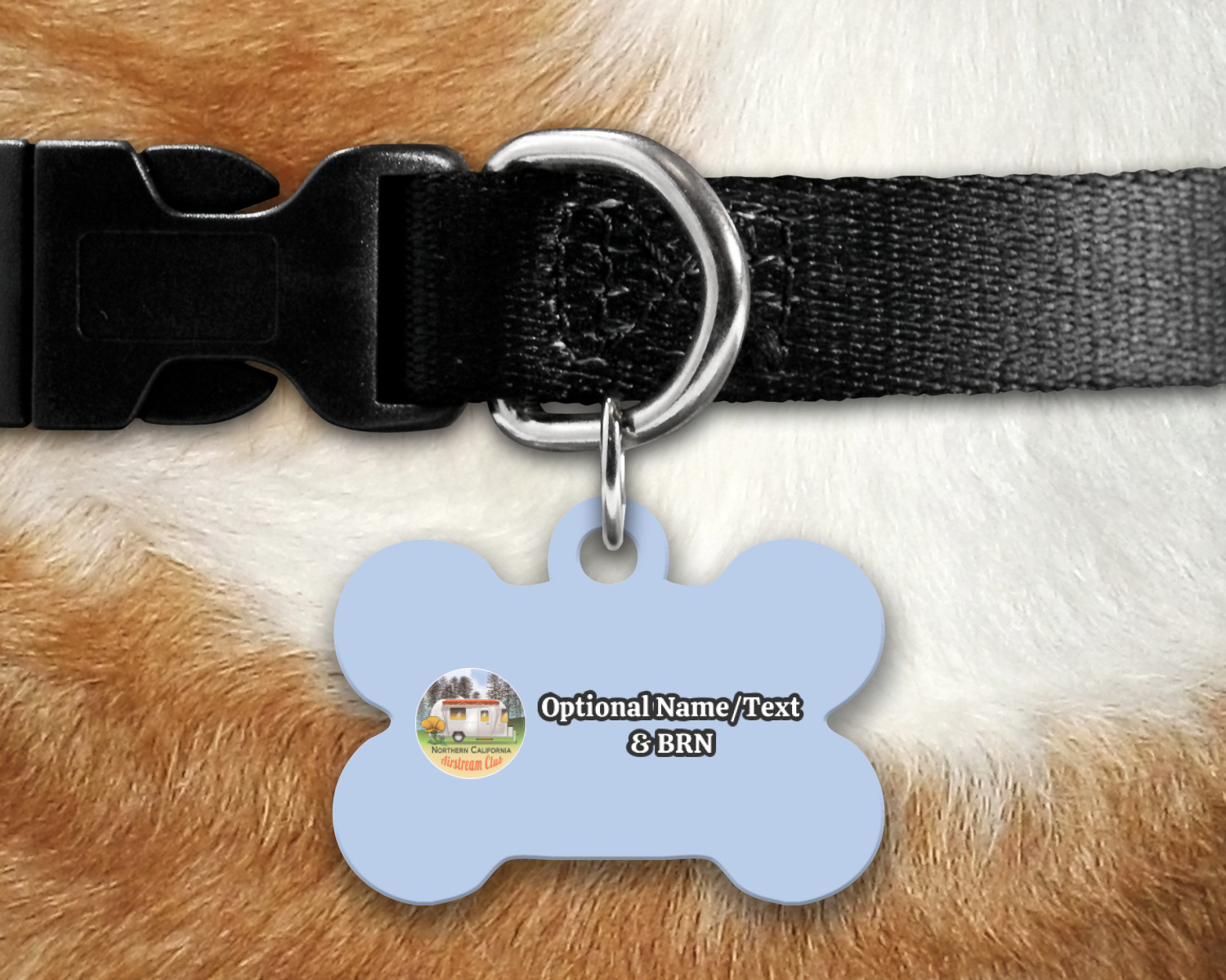 Shaped like a bone and made from aluminum, these tags are available in 2 different sizes.