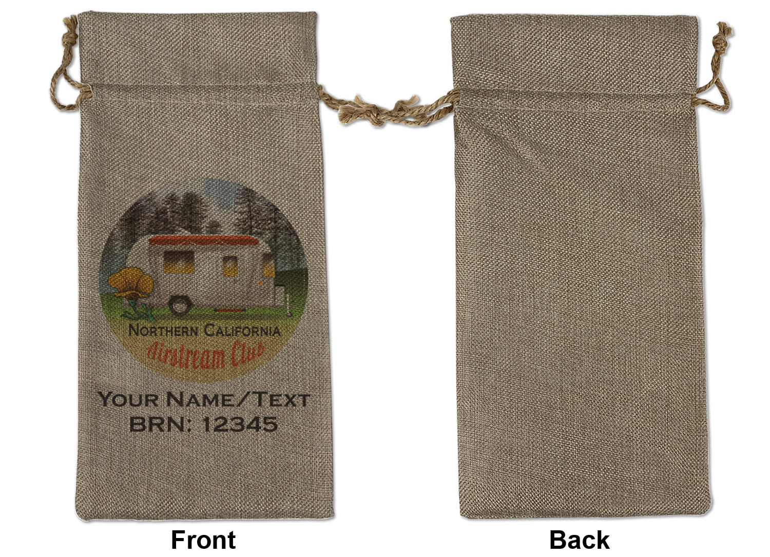 We sell our Burlap Gift Bags in 3 variant sized bags. Made with burlap polyester, each personalized bag can be secured with a twine drawstring pull. Your custom design is available to print on one side or both sides - completely up to you! The sizes of the bags measure approximately 4.5" x 6.5" for the smallest size, 6.5" x 8.0" for the medium size, and 6.5" x 13.5" for the large-sized bag.