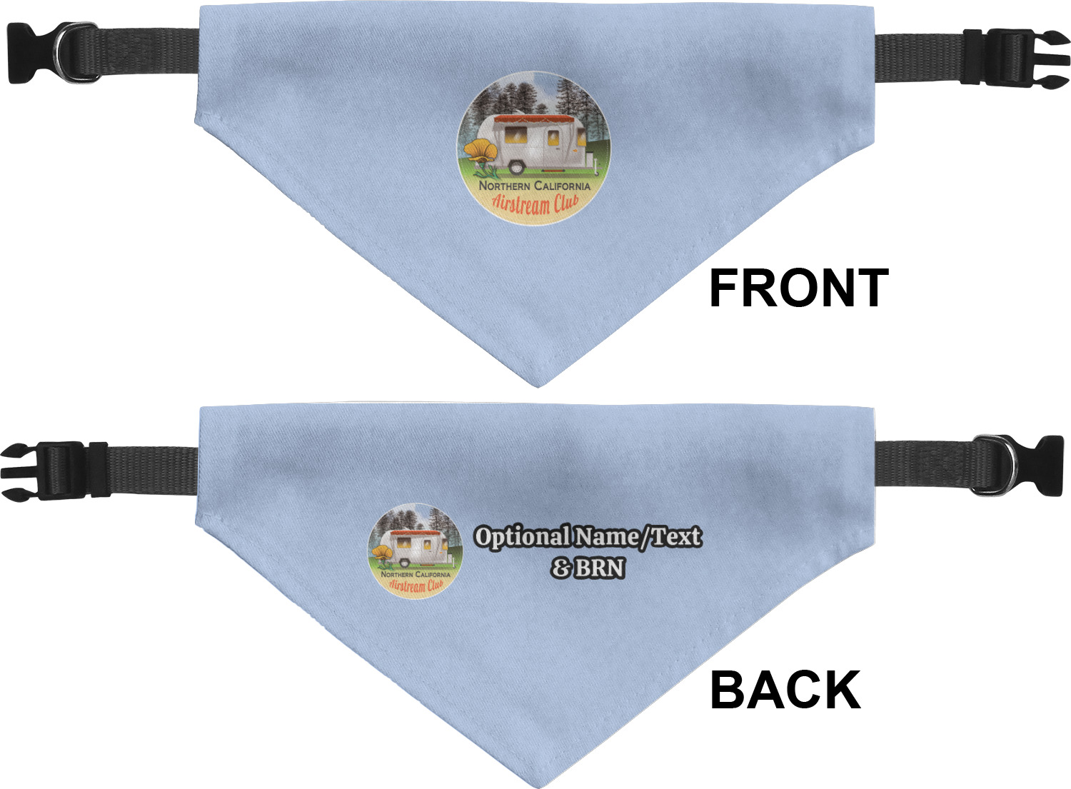 We print the front and back of these dog bandanas with your customized design. The bandana itself is made from a durable polyester, sewn together with a gap large enough to accommodate any collar. Regardless, the bandana includes a plain black, canvas collar with plastic snaps, that can easily be removed if desired. These dog bandana collars are available in four sizes: small, medium, large, and extra large. Please see our sizing chart for more information regarding the dimensions of each size.