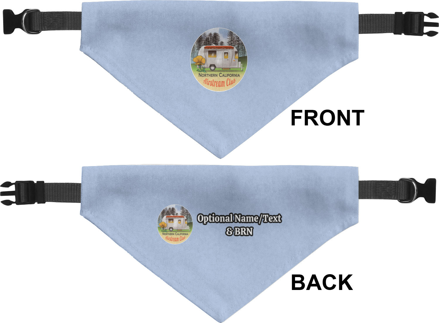 We print the front and back of these dog bandanas with your customized design. The bandana itself is made from a durable polyester, sewn together with a gap large enough to accommodate any collar. Regardless, the bandana includes a plain black, canvas collar with plastic snaps, that can easily be removed if desired. These dog bandana collars are available in four sizes: small, medium, large, and extra large. Please see our sizing chart for more information regarding the dimensions of each size.