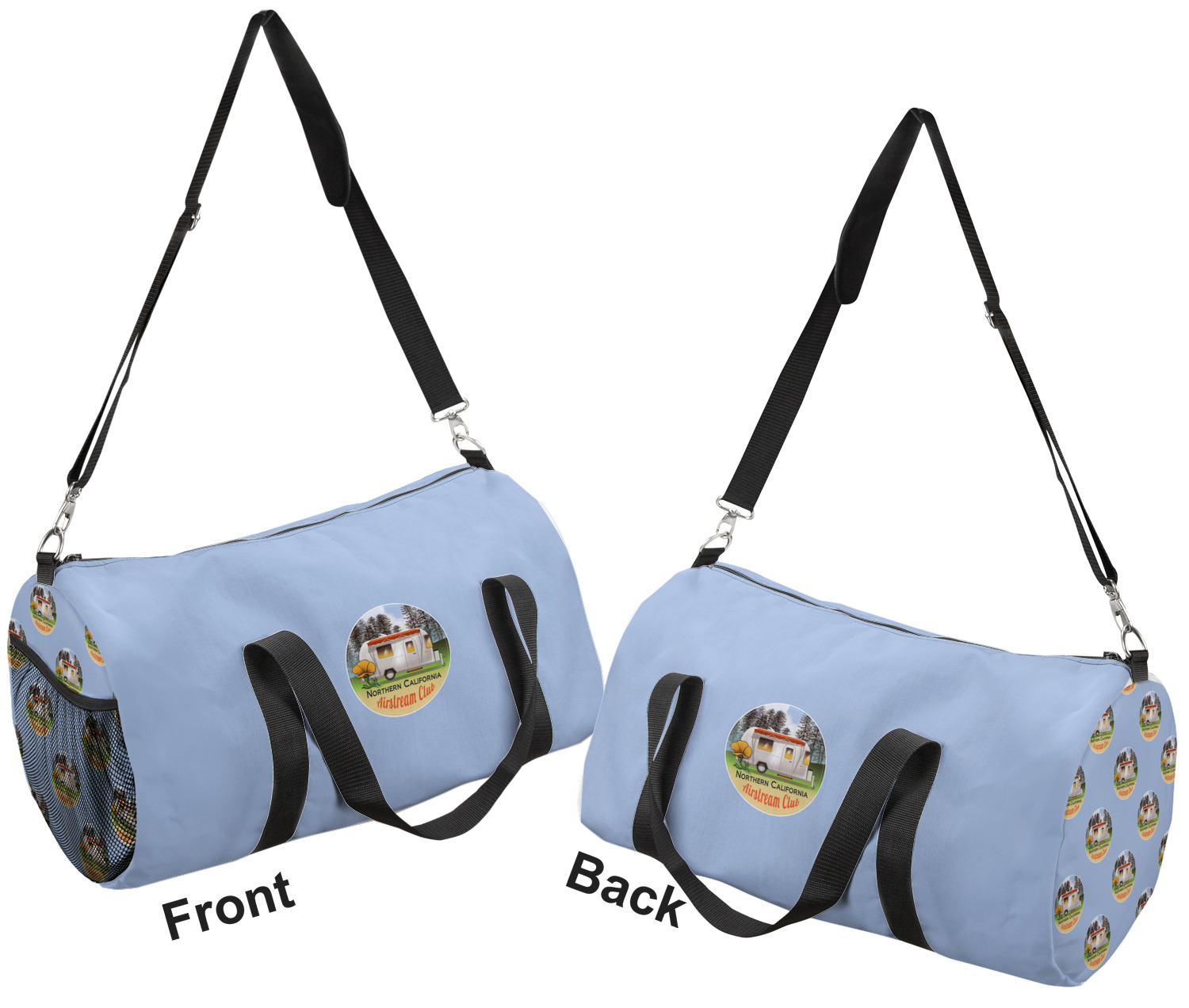 This duffle is a sturdy bag made of a canvas material. It comes in two sizes: Small (19"W x 9.5"H x 9.5"D) and Large (23"W x 12"H x 12"D). The bag is a cylindrical shape with a black adjustable strap and two handles. On one side is an elastic pouch to put a waterbottle or other small item. Your product will be sublimated with your design and is able to be designed on the front, back, and sides. Be sure to remember that the straps may cut into parts of your design if you upload your own artwork.
