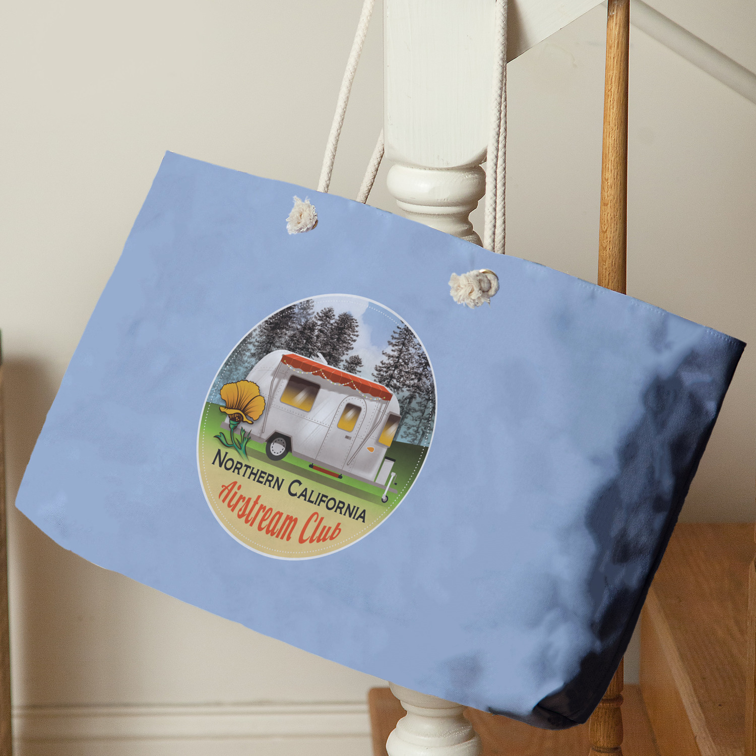 These large totes are handmade i.e. printed, cut and sewn right here in the USA. The canvas like material is printed using dye sublimation; the fabric is then cut and sewn along with a beautiful cream colored lining (to match the rope handles). The brass grommets are then added and the cream colored rope if fed through the grommets and knotted.