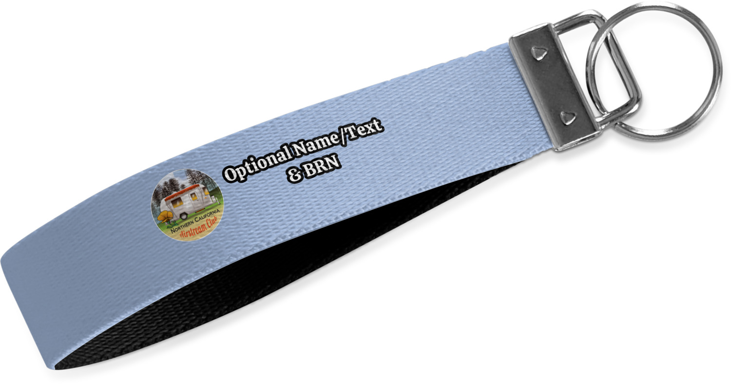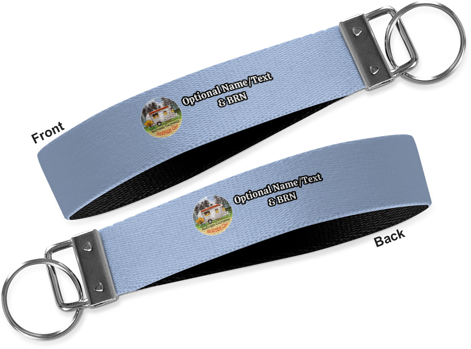 These key fob keychains are made from a polyester weave, right here in the USA. They feature a silver, metal clasp, attached to a round keyring. The piece gives the personalized wristlet a beautiful, finished look. Your customized design is printed on the outside of the keychain strap. We carry these wristlets in two sizes: small, which is 5 inches in width, and large, which is 5.5 inches in width.